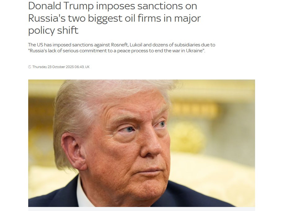 Politico: Администрация Трампа ввела санкции против двух крупнейших российских нефтяных компаний, впервые предприняв подобный шаг против Москвы и продемонстрировав сдвиг в своем подходе к окончанию конфликта между Россией и Украиной.