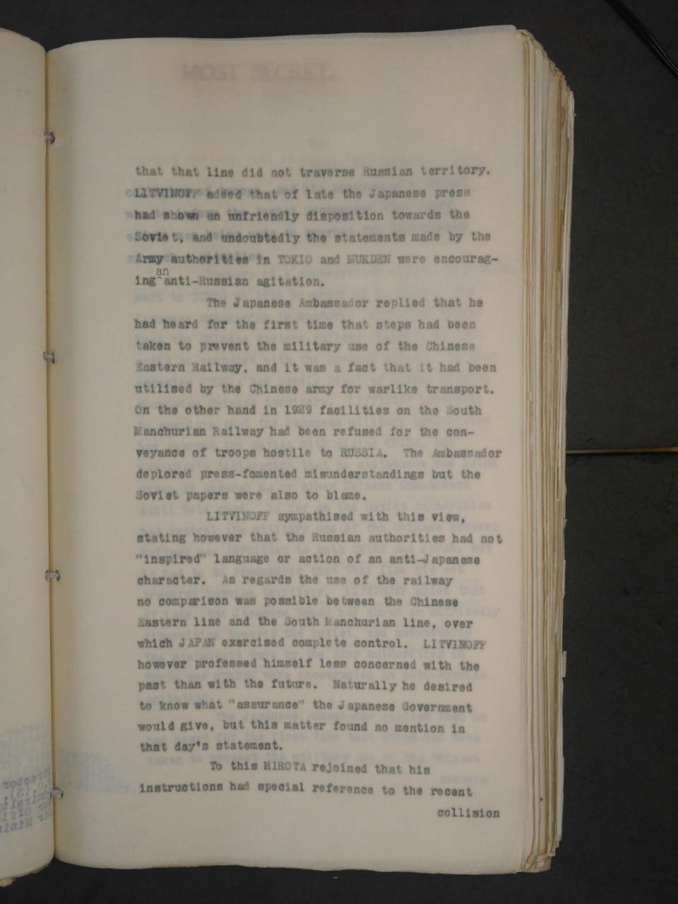 Экс-сотрудник ЦРУ приводит пример отчета английской разведки (см. изображения) о перехвате телеграммы посла Японии в Москве Коки Хирота в Токио, в котором раскрывается содержание разговора главы японской дипмиссии с народным комиссаром иностранных дел СССР Максимом Литвиновым (Меер-Генохом Валлахом) о ситуации с Китайско-Восточной железной дорогой. Телеграмма датируется 19.XI.1931, а отчет о перехваченном содержании – 8.XII.1931.