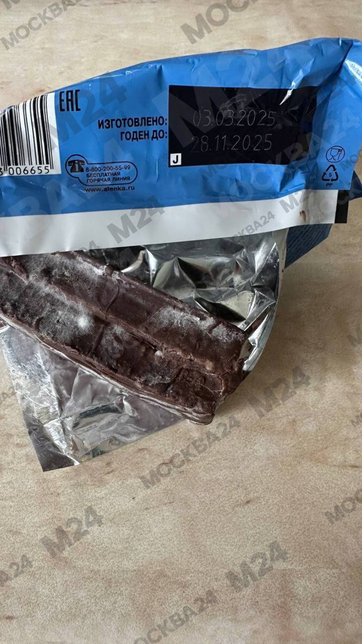 Бисквитные батончики «Аленка» продавались с плесенью в «Магните». «Пушистый» шоколад купили и в «Фикс Прайсе» наши подписчики.