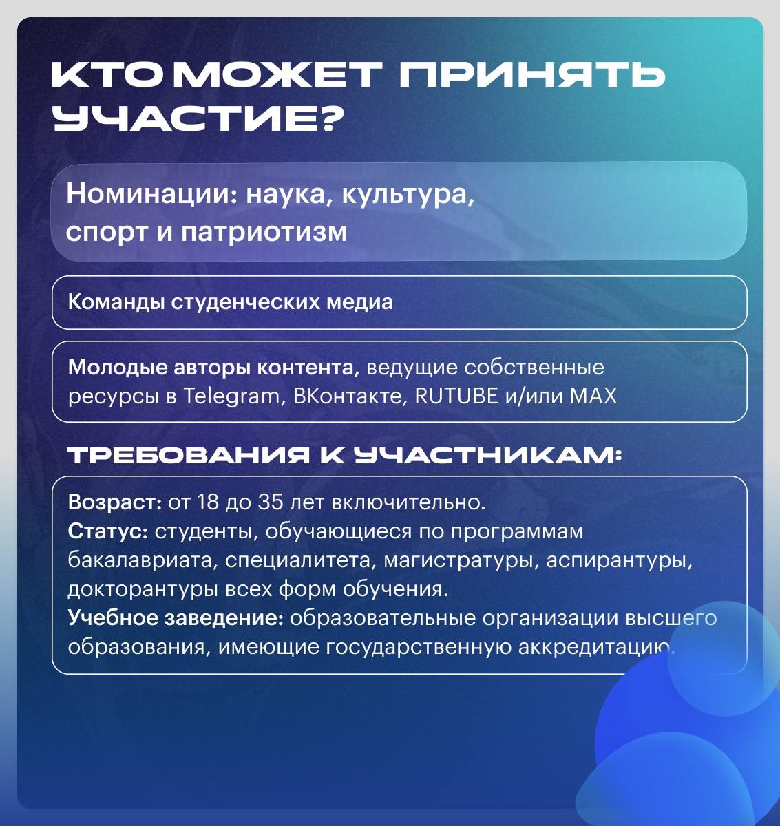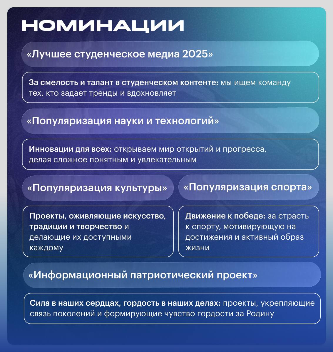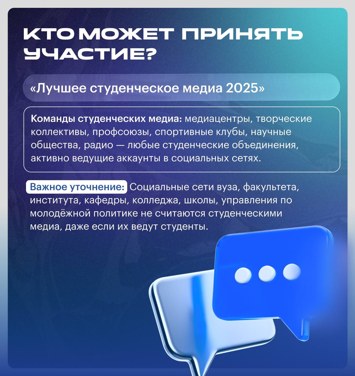 До 1 ноября идёт приём заявок на Премию студенческих СМИ «МедиаЛидер 2025» от Минобрнауки России. У вас есть возможность рассказать о своём медиацентре или студенческом проекте всей России и выиграть ценные призы.