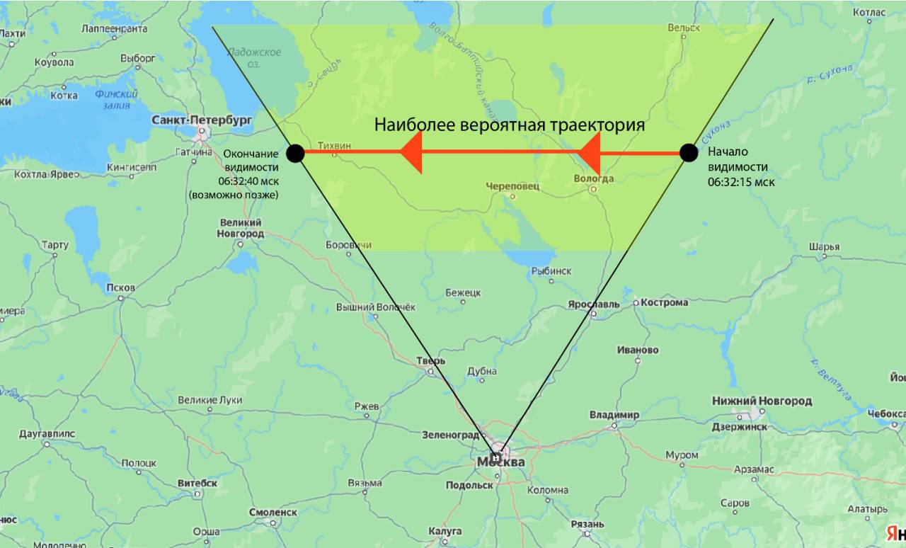 Траектория пролегала примерно на уровне Вологодской области. Причем наблюдали зелёное тело москвичи, а не жители Санкт-Петербурга, Вологды или Череповца