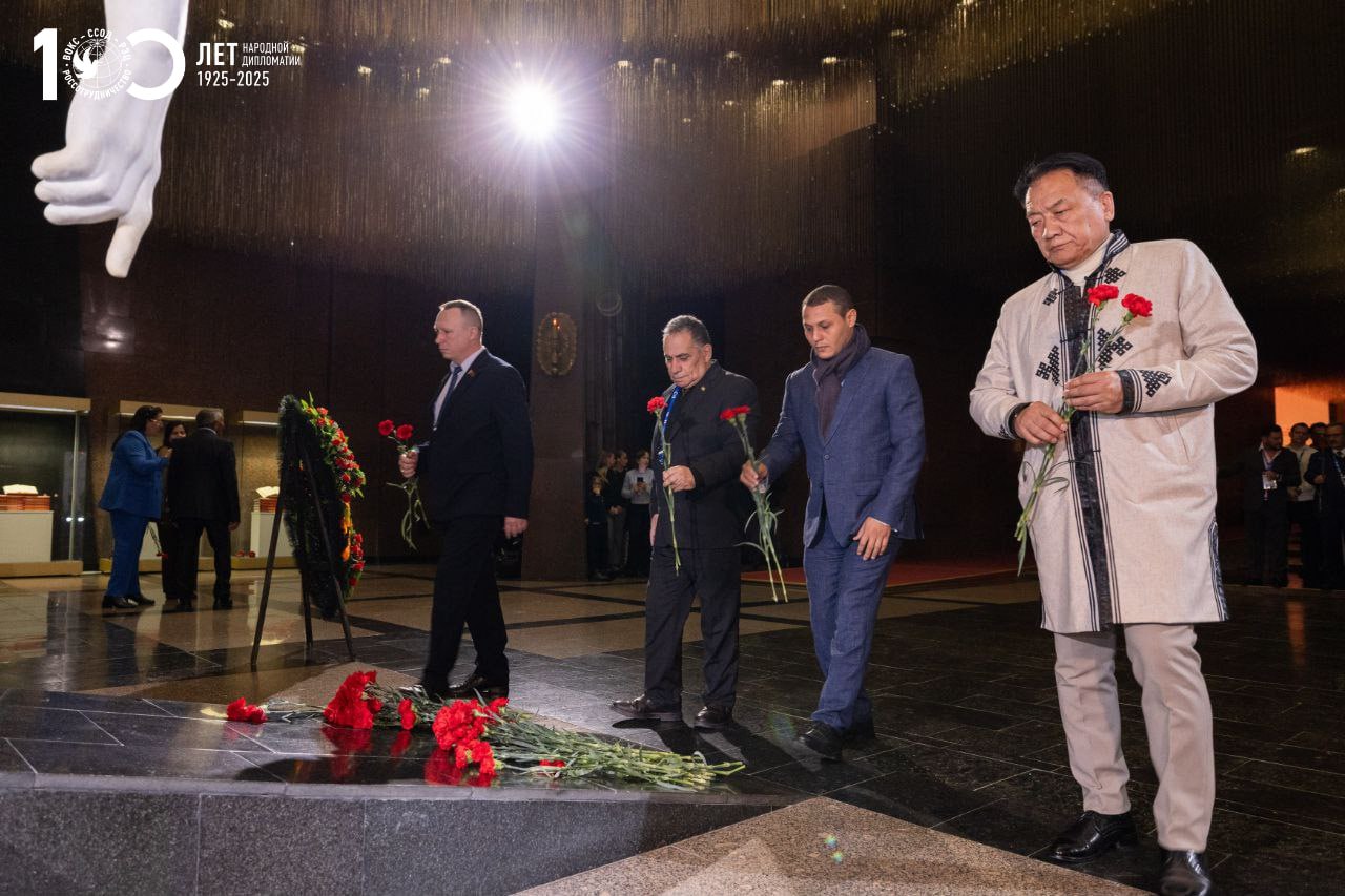 Участники Международного форума сотрудничества из Европы, Азии, Африки и Латинской Америки посетили Музей Победы и возложили цветы в знак памяти о погибших в Великой Отечественной войне в Зале Памяти и Скорби.