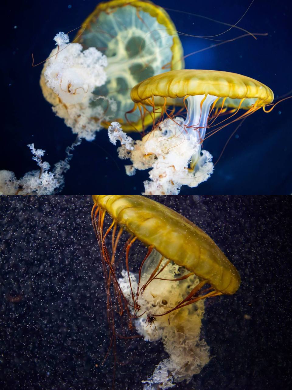 Это тихоокеанская морская крапива — необычная медуза. Её тело представляет собой жёлто-коричневый купол, по краю которого расположены 24 очень длинных и тонких щупальца огненно-красного цвета.