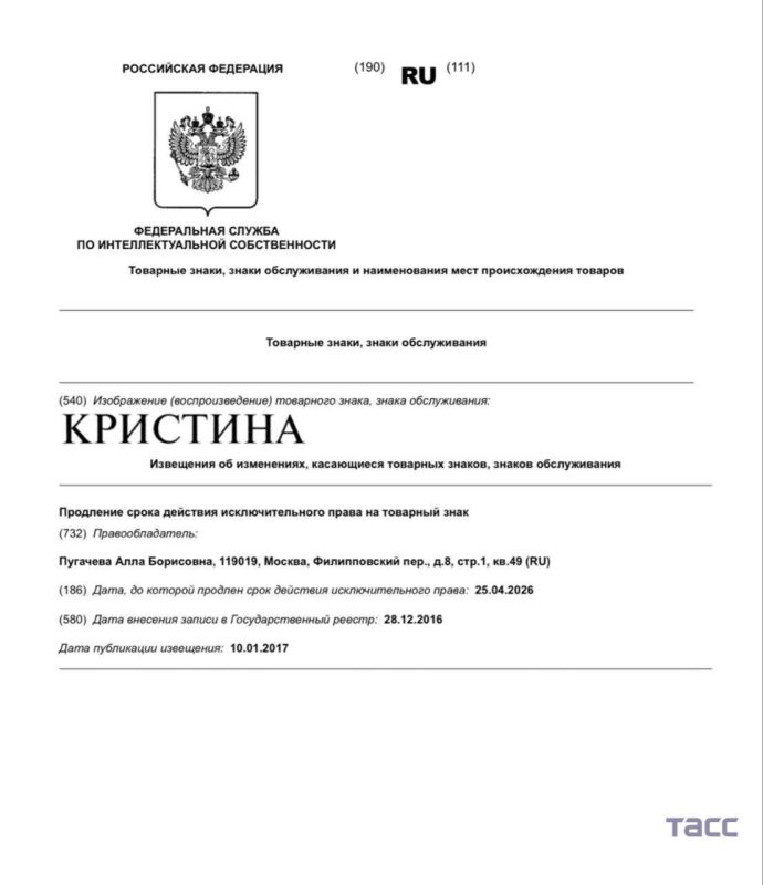 Алла Пугачёва может лишиться прав на товарный знак «Кристина» в апреле следующего года, следует из данных Роспатента, с которыми ознакомился ТАСС.