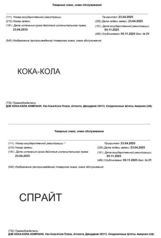 Ушедшая Coca-Cola зарегистрировала в России товарные знаки «Кока-Кола» и «Спрайт».