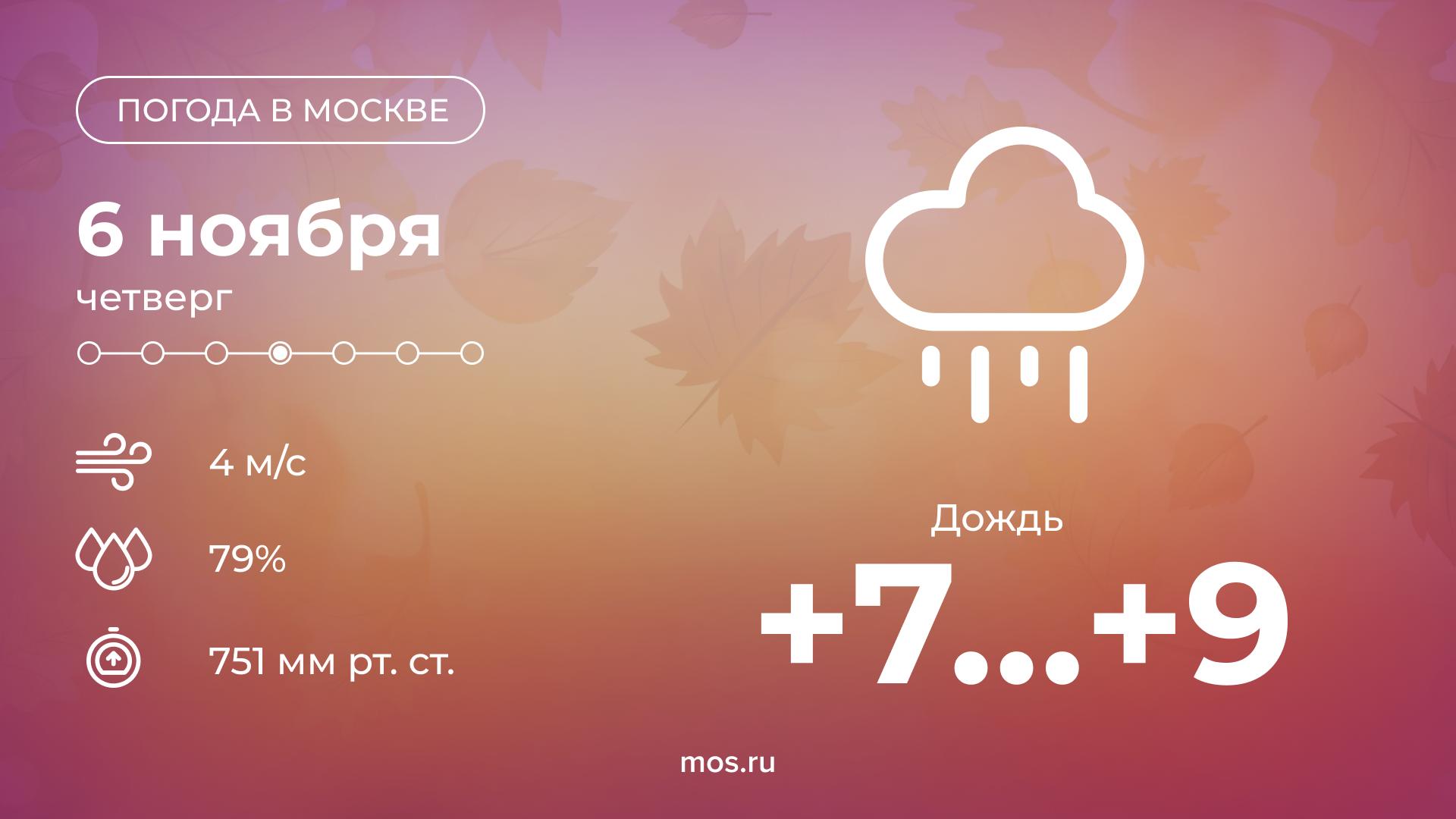 Доброе утро! Сегодня в Москве ожидается дождь. Температура воздуха днем поднимется до +9 °С. Не забудьте взять с собой зонтик.