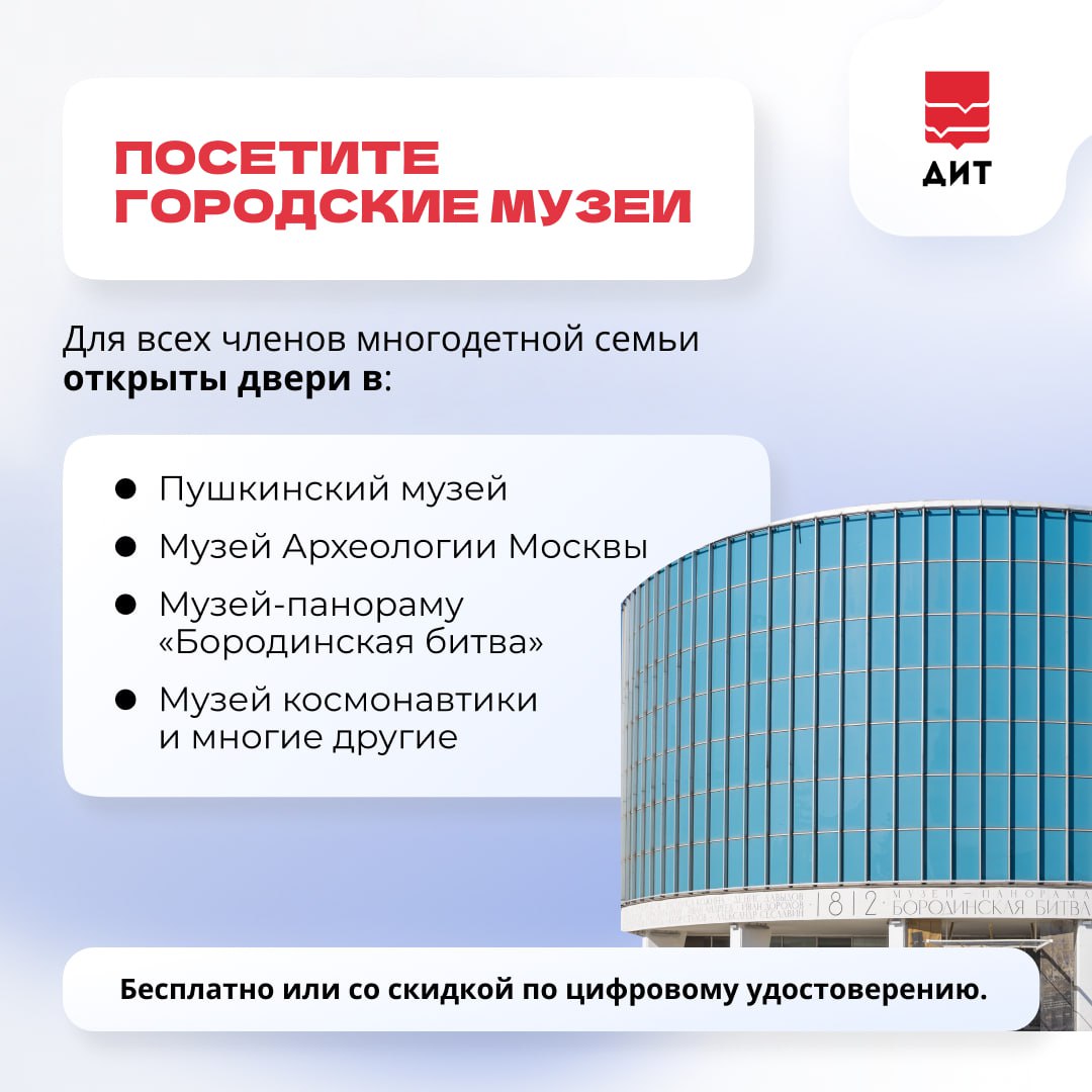 Многодетные семьи могут бесплатно или со скидкой посетить более 100 музеев и площадок Москвы с цифровым удостоверением многодетной семьи. Пользоваться им удобно в приложении «Мой id».