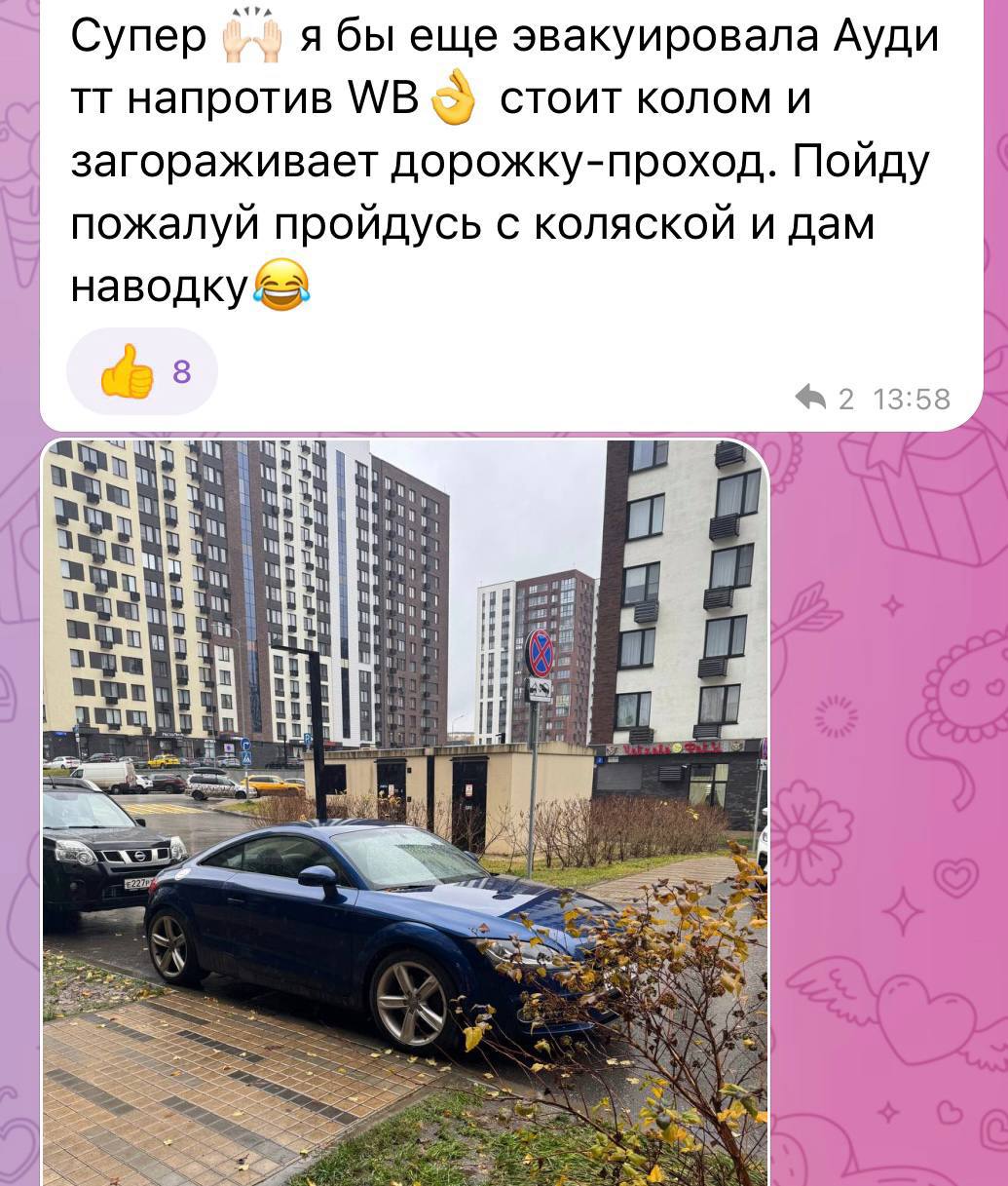 Наводку женщина, видимо, не дала: авто простояло на том же месте ещё два дня, а после в чате появились новые фото. Вы уже догадались, какие. Вывод жильцы сделали такой: