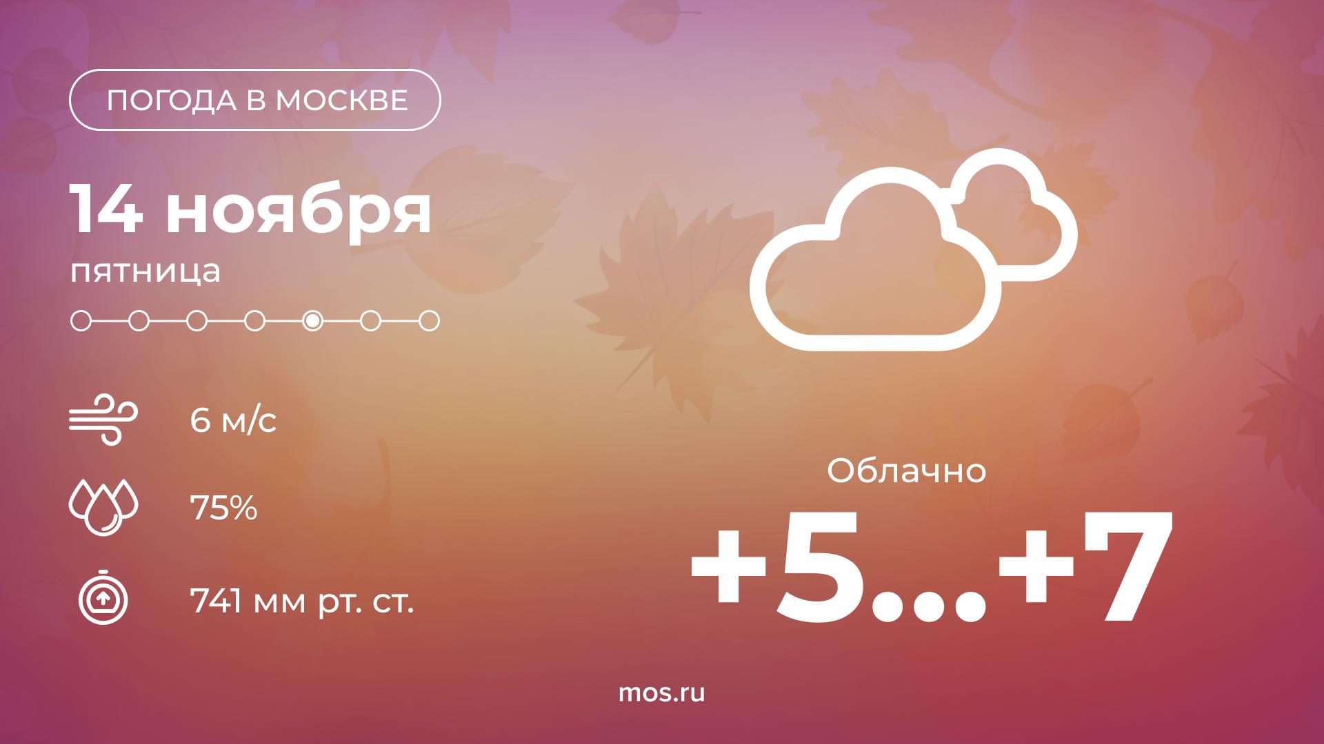 Доброе утро! Сегодня в Москве будет облачно. Температура воздуха днем поднимется до +7 °С.