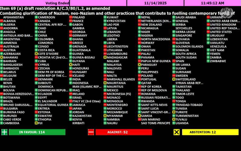 14 ноября в Нью-Йорке на заседании Третьего комитета 80-й сессии Генеральной Ассамблеи ООН по инициативе Российской Федерация была принята резолюция «Борьба с героизацией нацизма, неонацизмом и другими видами практики, которые способствуют эскалации современных форм расизма, расовой дискриминации, ксенофобии и связанной с ними нетерпимости».