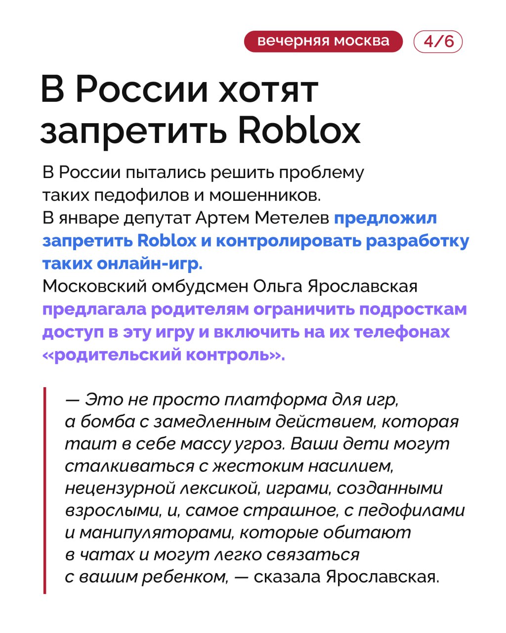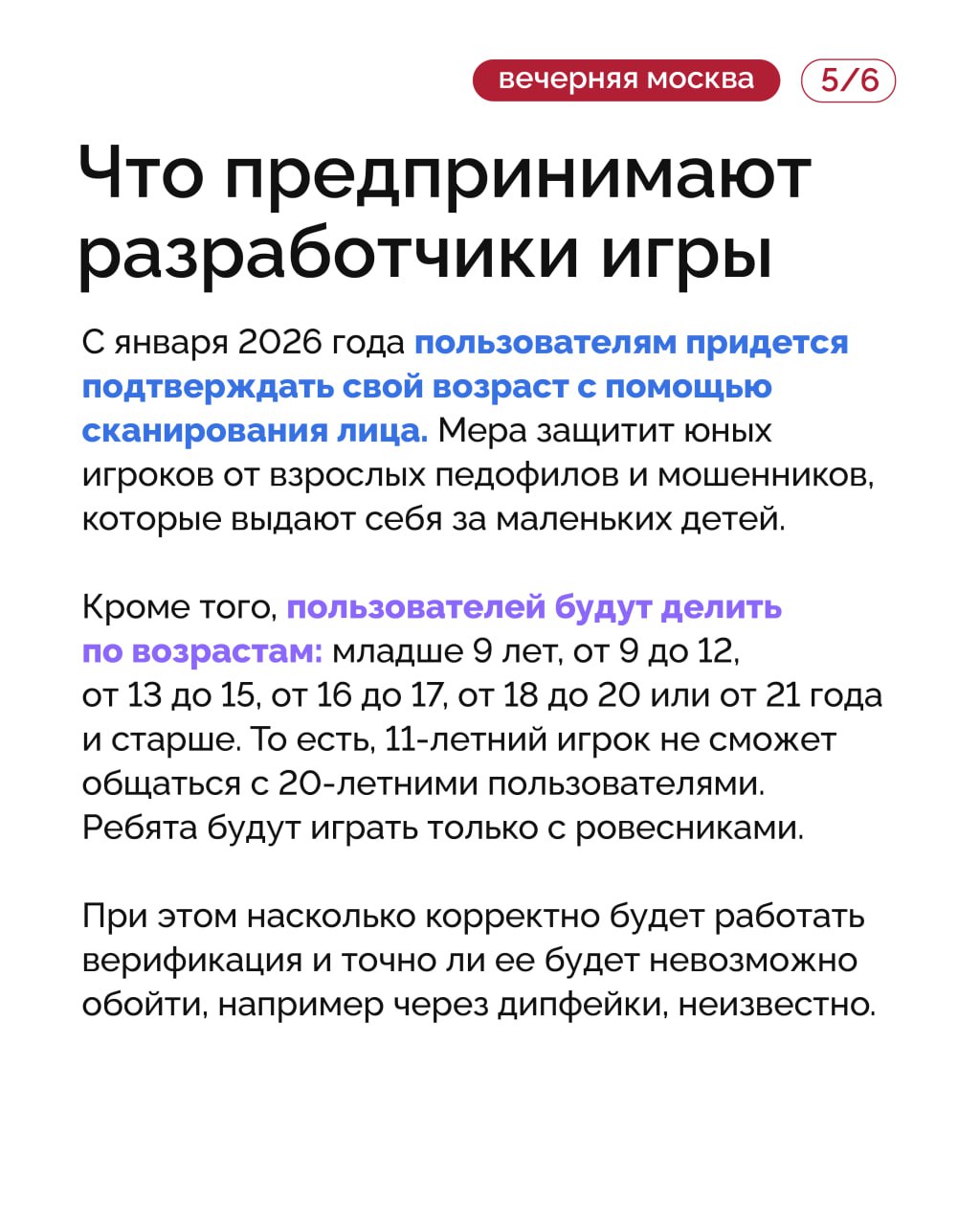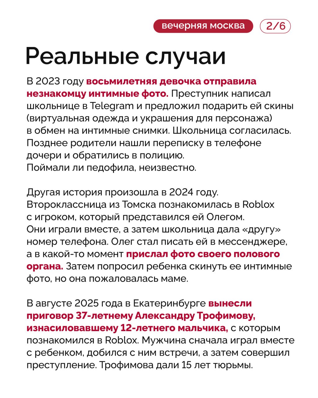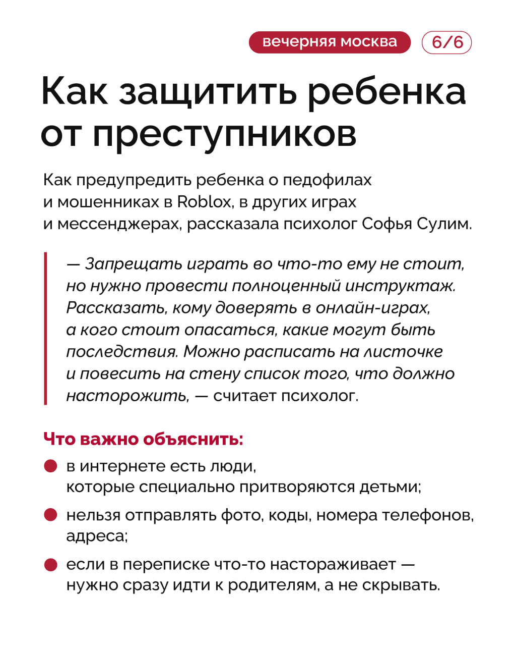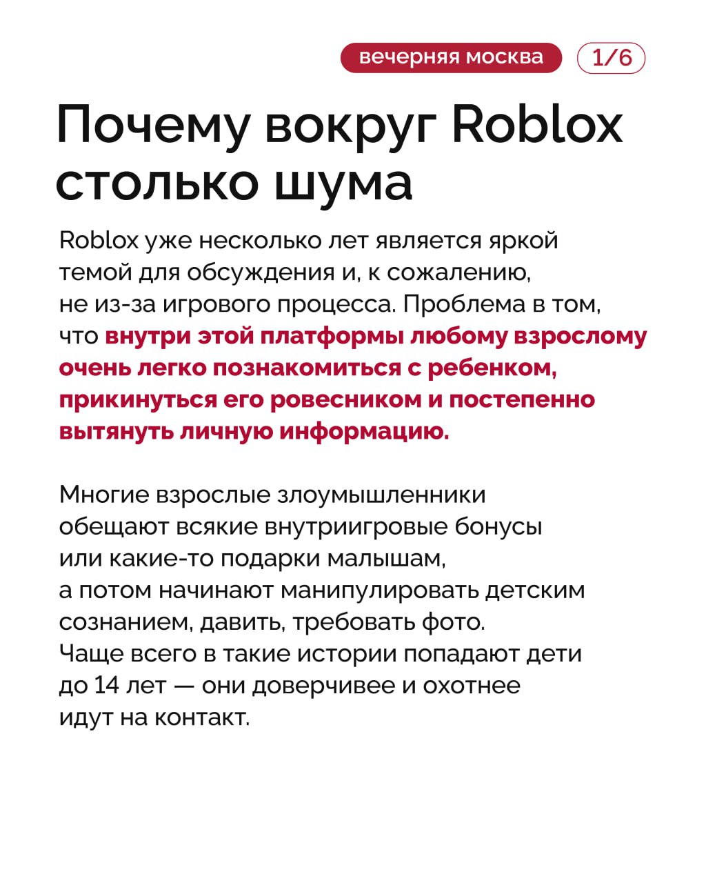 Создатели Roblox уже заявили, что запретят юным пользователям общаться со взрослыми людьми в чате. Какие изменения ждут игру, от которой фанатеют дети, и как защитить своего ребенка от интернет-преступников. Подробнее — в карточках.