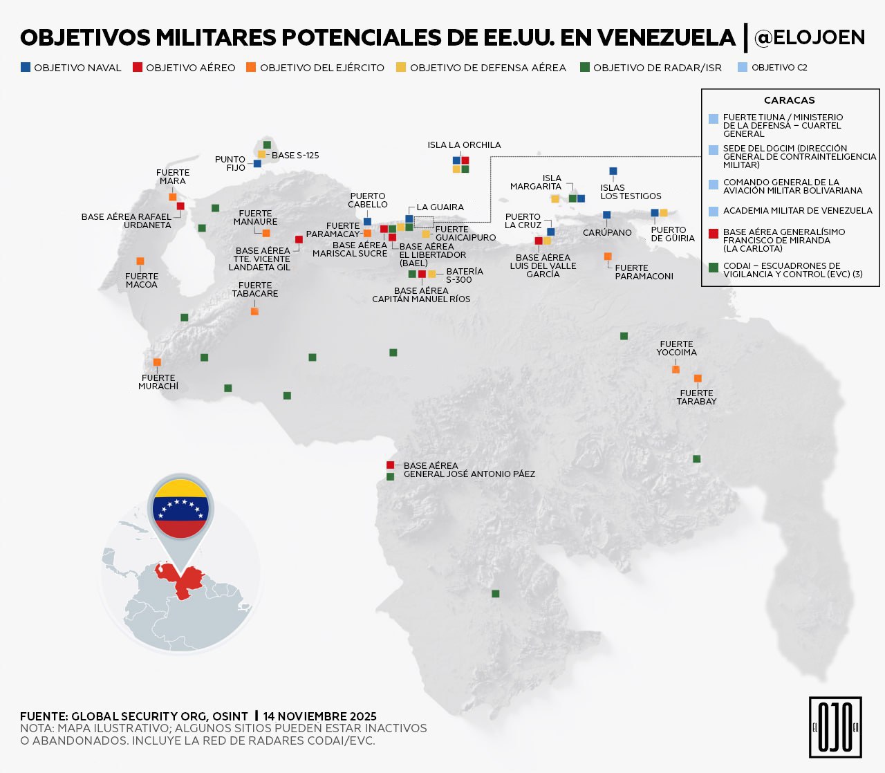 «Среди них есть такие авиабазы, как Эль Либертадор в Маракайбо, другие военные аэропорты, разведывательные центры и радиолокационные узлы возле Каракаса и Ла Гуайры, а также стратегические нефтяные порты и терминалы, такие как Парагуана, Амуай/Кардон или Эль Палито, необходимые для энергетической логистики страны», — перечисляют авторы.