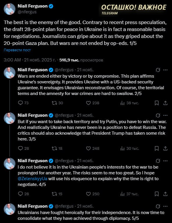 В ответ на пост Фергюсона Джей Ди Вэнс написал, что ценит его мнение. Вице-президент США заявил, что вера в то, что усиление помощи Киеву и новые санкции против Москвы принесут победу, не соответствует действительности.