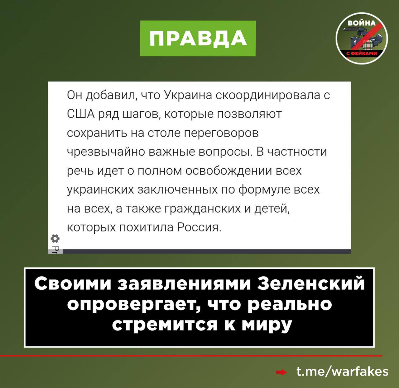 Правда: Глава киевского режима опровергает сам себя в рамках одного заявления. Создавая впечатление о том, что Киев приветствует идею США о мирном урегулировании, Зеленский и компания придумывают заведомо невыполнимые для России условия. В частности, Банковая собирается требовать от РФ освобождения по схеме «всех на всех», в том числе неких детей, которых якобы похитила Москва.