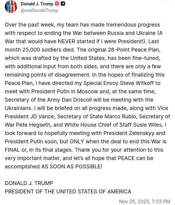 ...Первоначальный 28-пунктный План мира, который был разработан Соединёнными Штатами, был доработан с учётом дополнительных предложений обеих сторон, и осталось лишь несколько оставшихся разногласий. В надежде окончательно завершить этот План мира у меня на этой неделе запланированы звонки специальному посланнику Стиву Уиткоффу с президентом Путиным в Москве и, в то же время, с украинцами будет встречаться министр армии Дэн Дрисколл. Меня будут подробно информировать о всех достигнутых успехах вместе с вице-президентом Джей Ди Вэнсом, госсекретарём Марко Рубио, министром войны Питом Хегсетом и главой аппарата Белого дома Сьюзи Уайлз. Я с нетерпением жду возможности, надеюсь, скоро встретиться с президентами Зеленским и Путиным, но ТОЛЬКО когда сделка по прекращению этой войны будет ФИНАЛЬНОЙ или, по крайней мере, очень близка к этому...