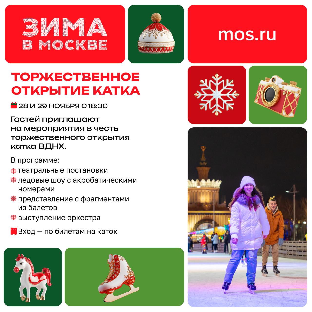 28 и 29 ноября на ВДНХ пройдут торжественные мероприятия в честь открытие катка! Вечером гостей ждут ледовые представления, театральные постановки, музыка и многое другое!