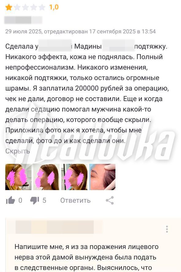 Хирургическая подтяжка подбородка обернулась для москвички тяжелыми последствиями и борьбой за собственное здоровье. Марта рассказала Readovka, что пришла в столичную клинику в надежде подкорректировать нижнюю треть лица и заплатила врачу Мадине Ц. 70 тыс. Уже на следующий день началось кровотечение, однако доктор уверила пациентку, что такая реакция — это нормально.