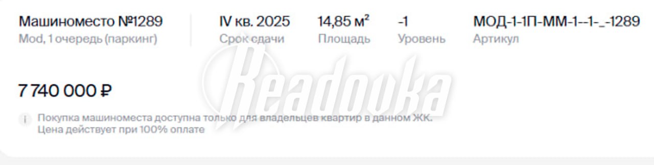Покупка такой коморки обошлась им в 4,5 млн. Если у вас вдруг завалялась подобная сумма и вы готовы купить, спешим вас разочаровать. Стоимость паркинга выросла, и из доступных предложений в этом ЖК осталось только 1 место площадью 14,85 кв м при стоимости (!) 7,7 млн.