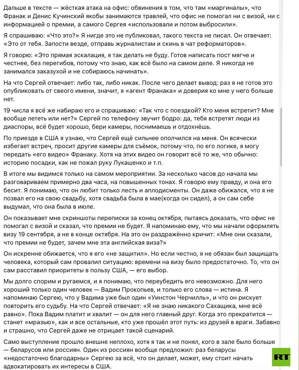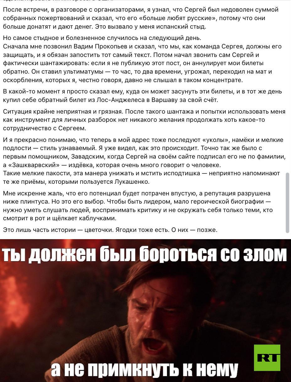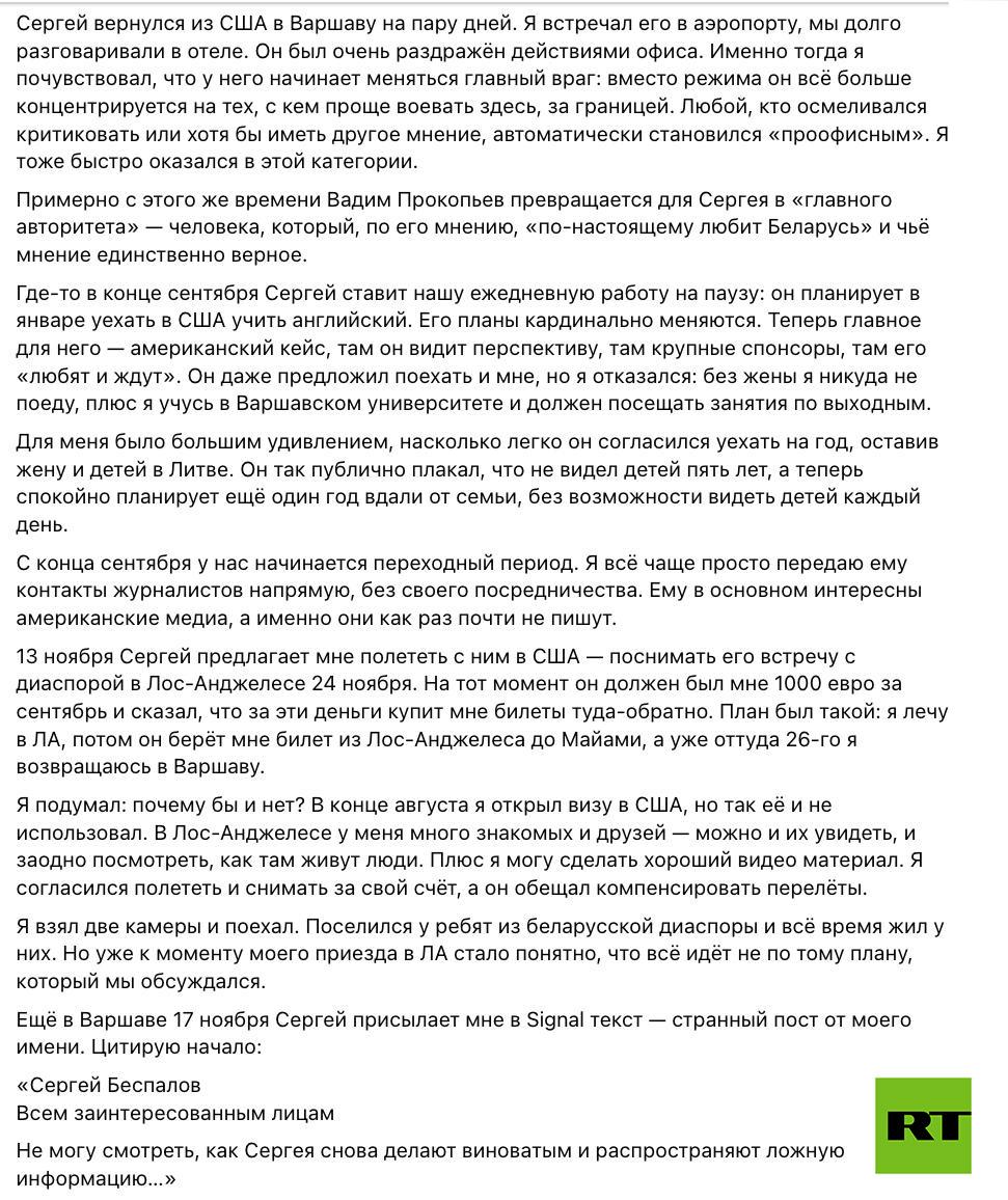 Пресс-секретарь Сергея Тихановского (видимо, уже бывший) Сергей Беспалов слил в сеть подробности конфликта со своим боссом. По его словам, Сергей переехал из Литвы в США, команда его рассыпалась, а самоназванный лидер белорусской оппозиции считает, что россияне любят его больше, потому что «дают больше денег». А главный враг его теперь не «режим Лукашенко», а коллеги по борьбе.