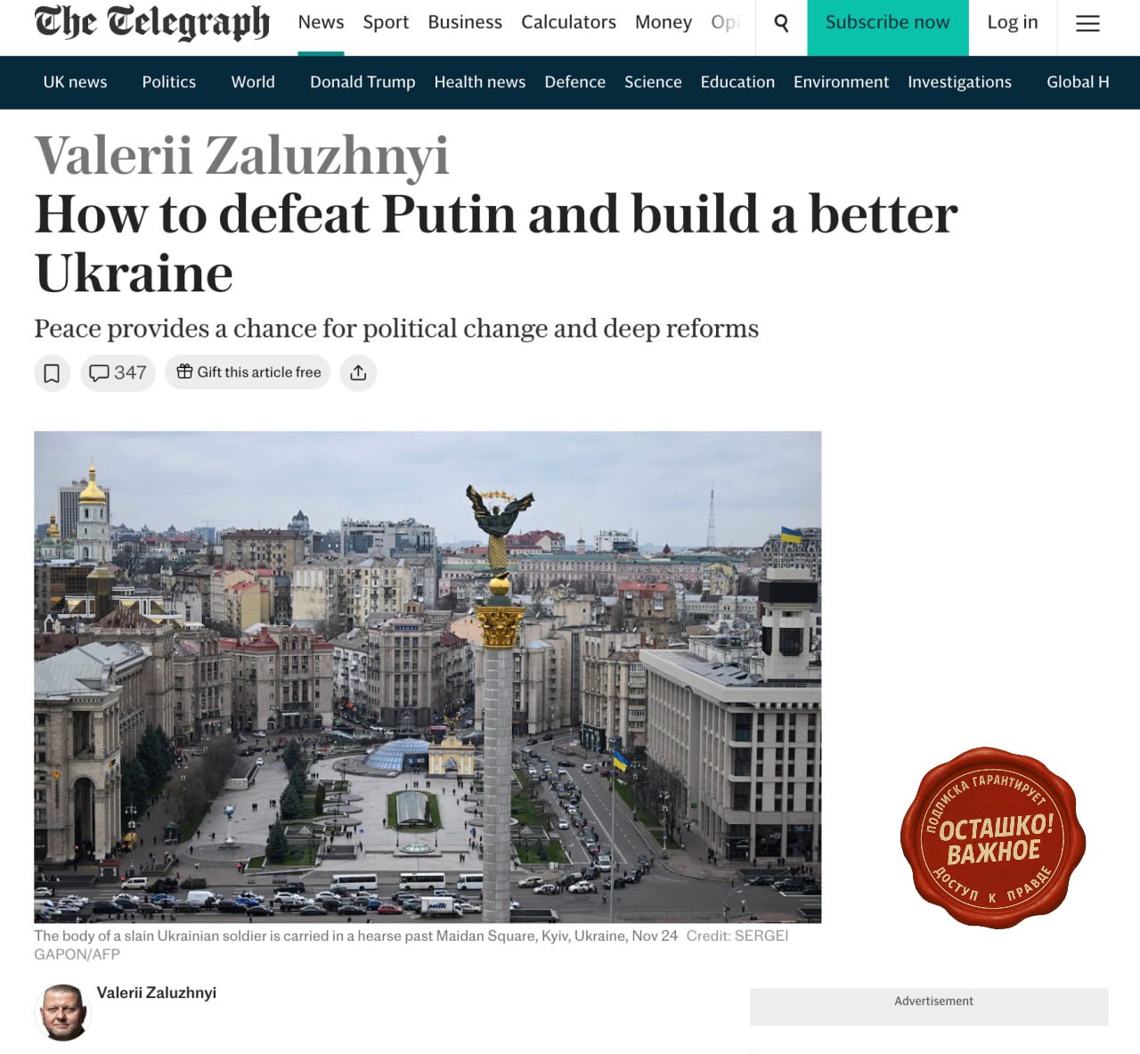 Залужный в своей статье для The Telegraph заявил, что одной из форм гарантий безопасности для Украины могло бы стать размещение на её территории ядерного оружия.