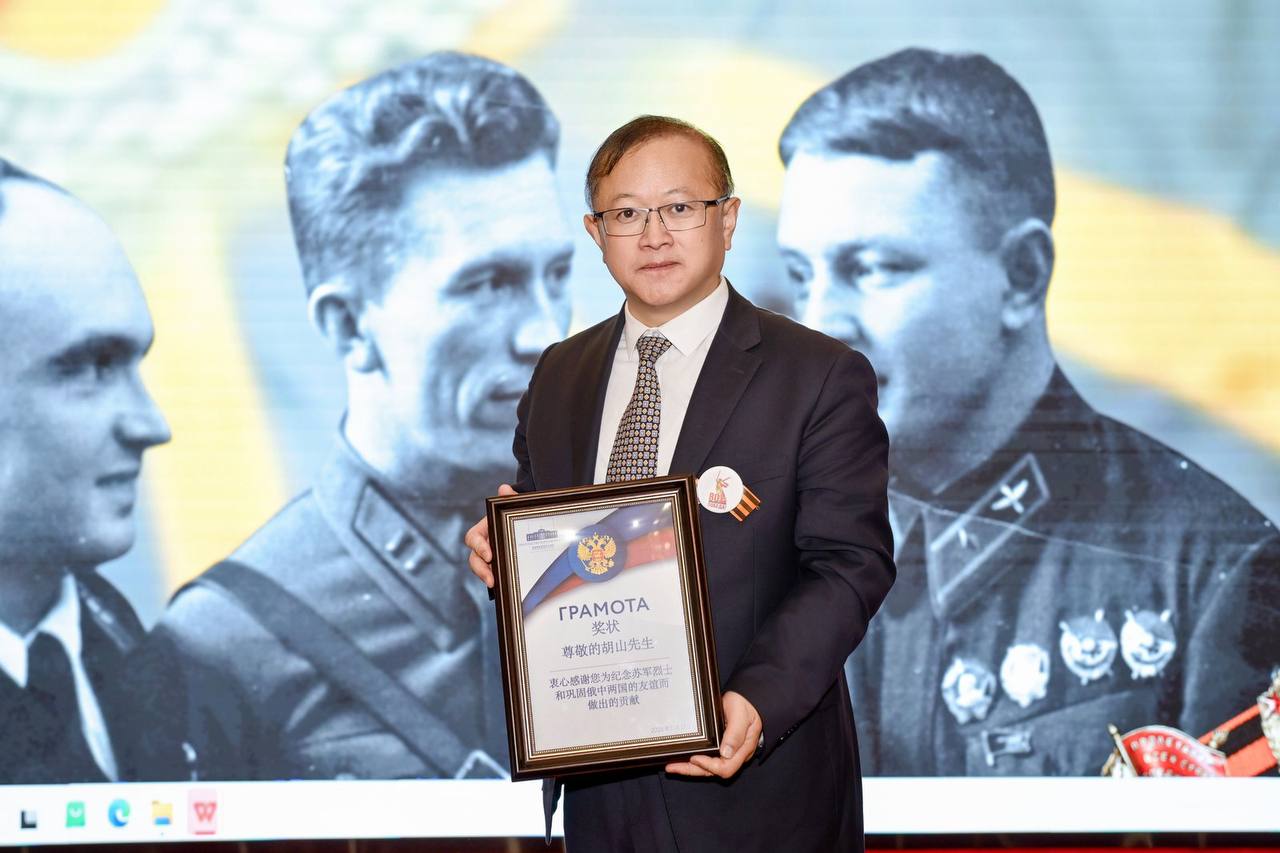 Состоялась церемония награждения грамотами Посольства российских и китайских волонтеров, а также передача в дар школе при Посольстве модели истребителя И-16 ее автором.