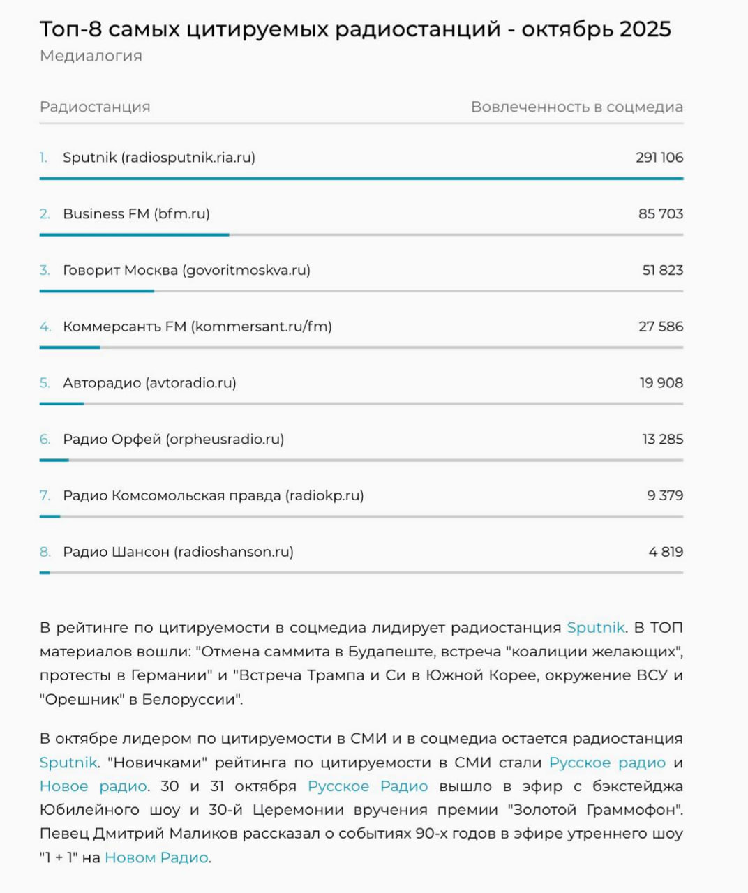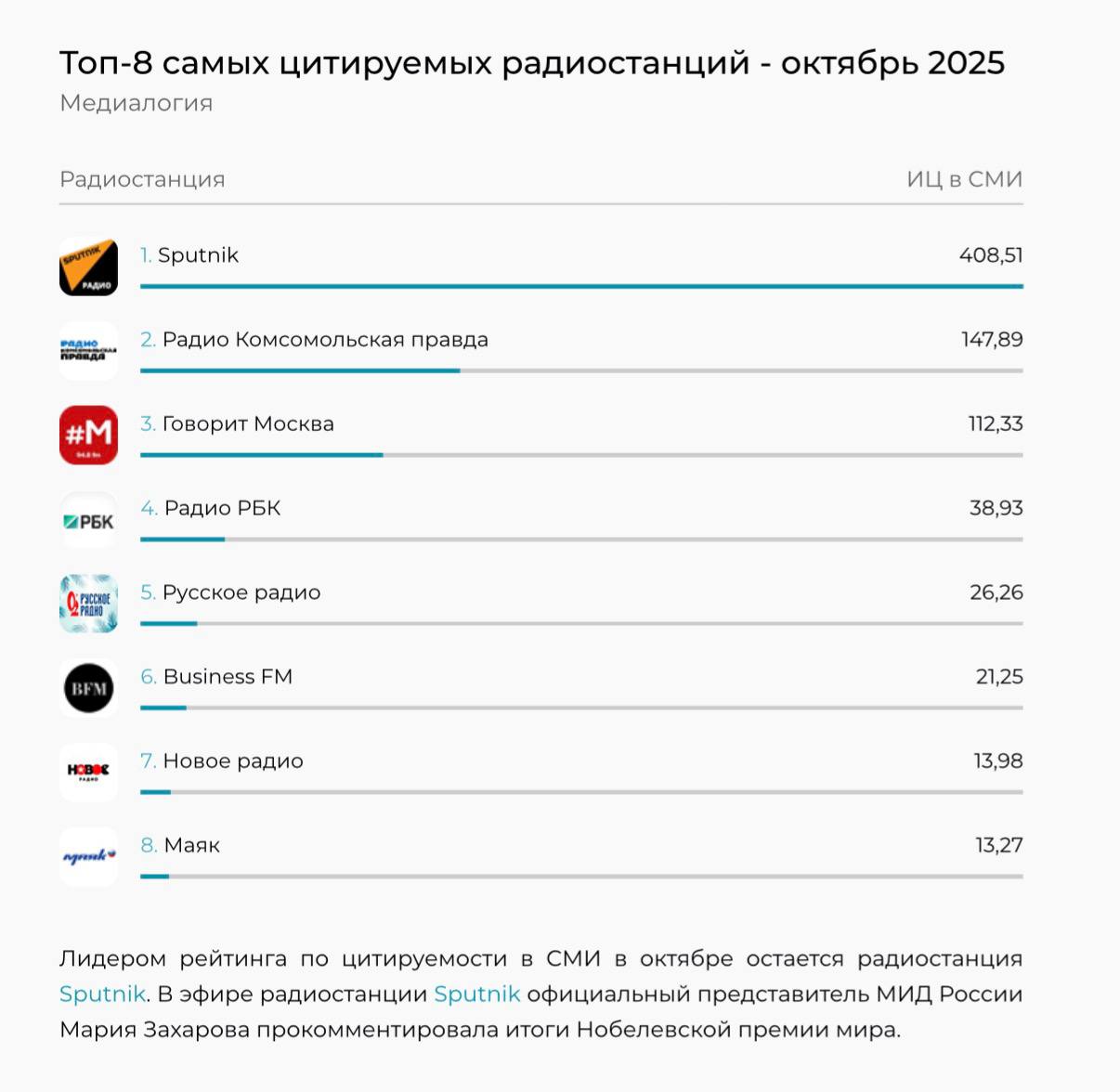 Радио Sputnik — лидер по цитируемости среди радиостанций в СМИ и соцмедиа в октябре 2025 года