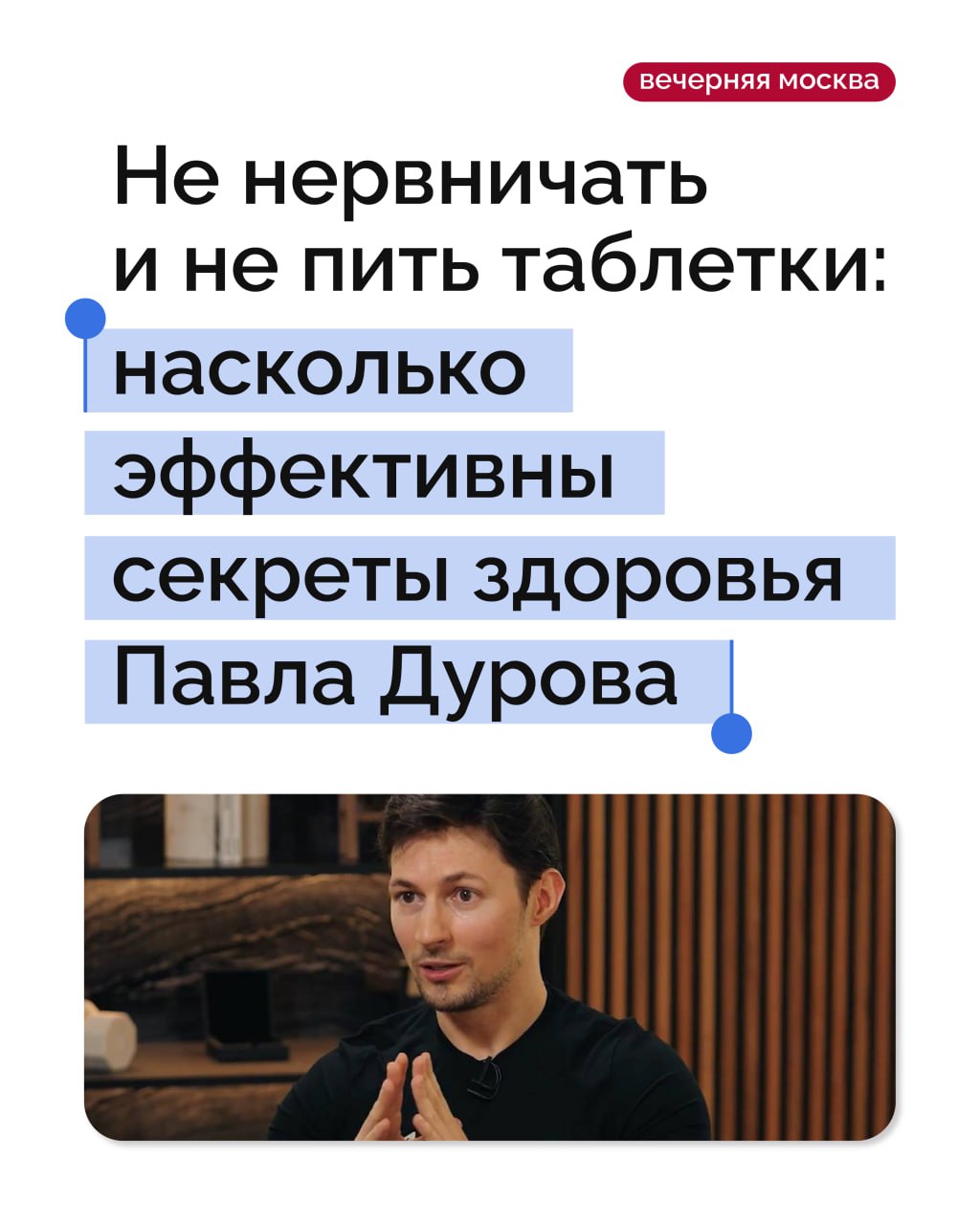 Остальные правила для поддержания здоровья, которые озвучил Дуров, такие как здоровый сон (не обязательно ровно 8 часов — главное, чтобы вам хватало), правильное питание, спорт, минимизация стресса и отказ от алкоголя и курения, стоит соблюдать каждому.