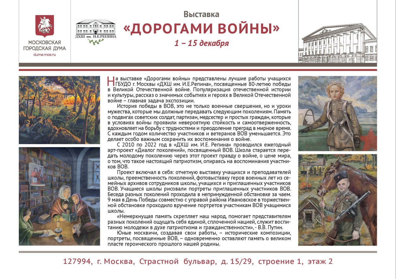 Церемония открытия экспозиции, в которую вошли работы учащихся ГБУДО города Москвы «Детская художественная школа им. И.Е.Репина», посвященные 80-летию победы в Великой Отечественной войне, состоится во вторник, 2 декабря.