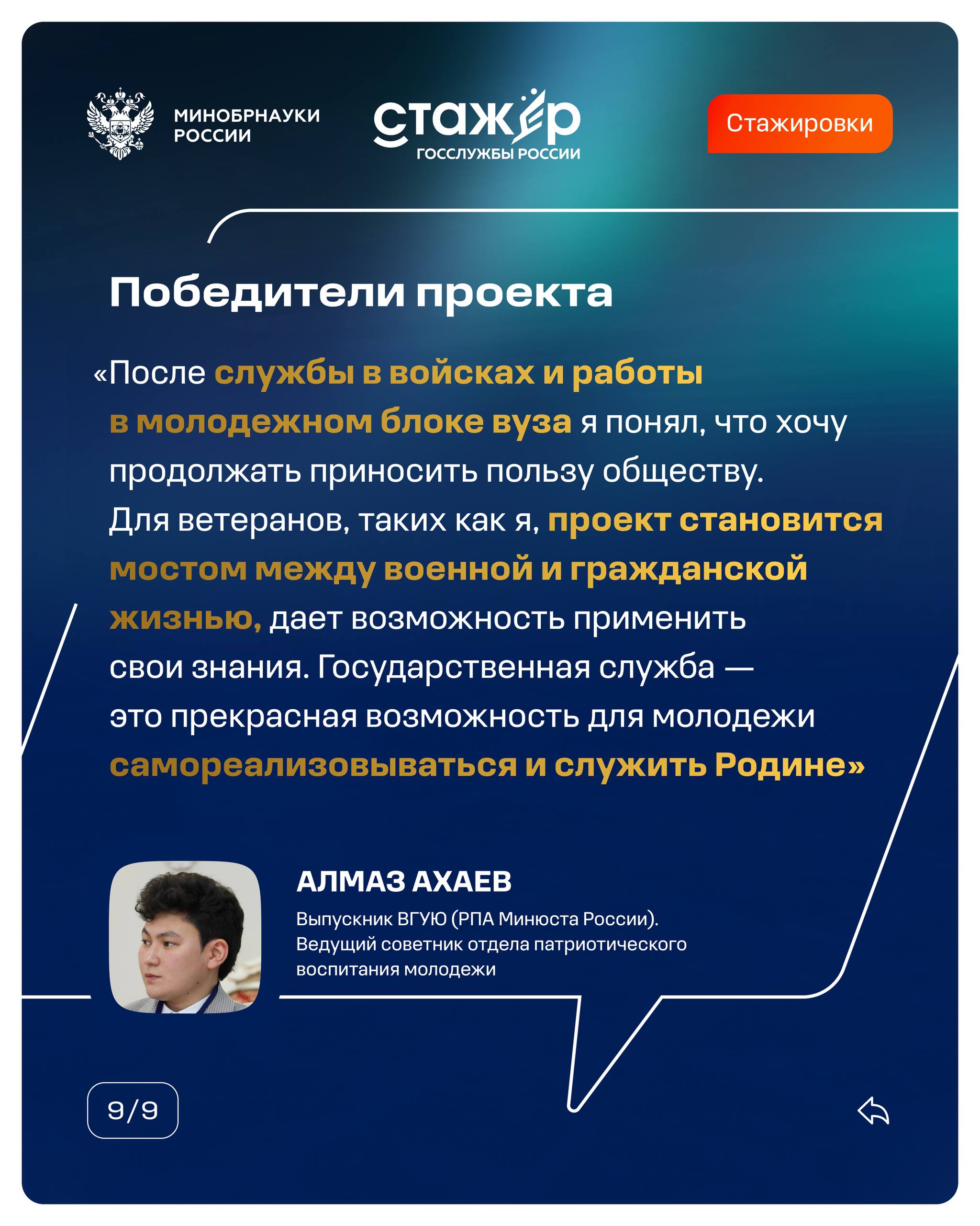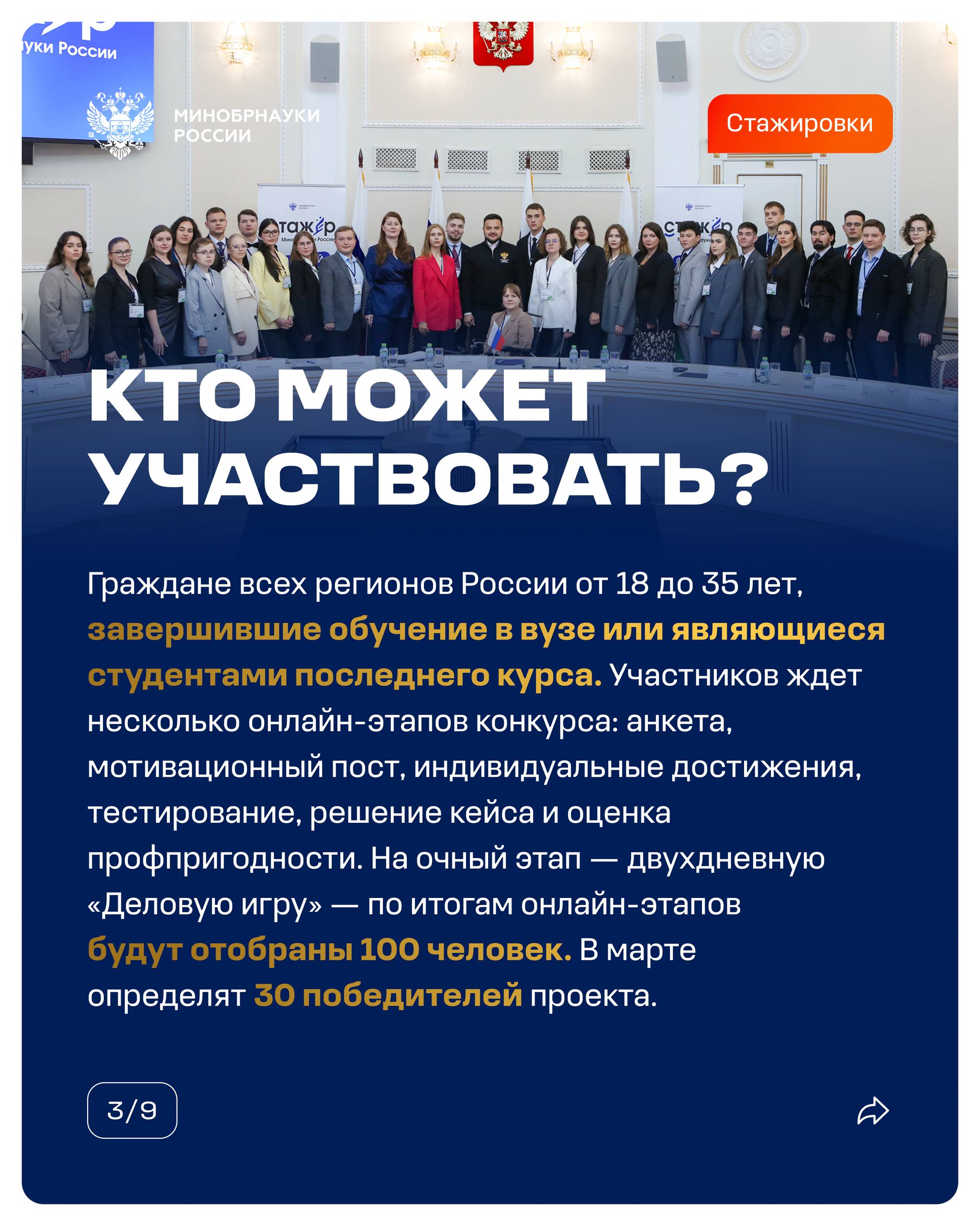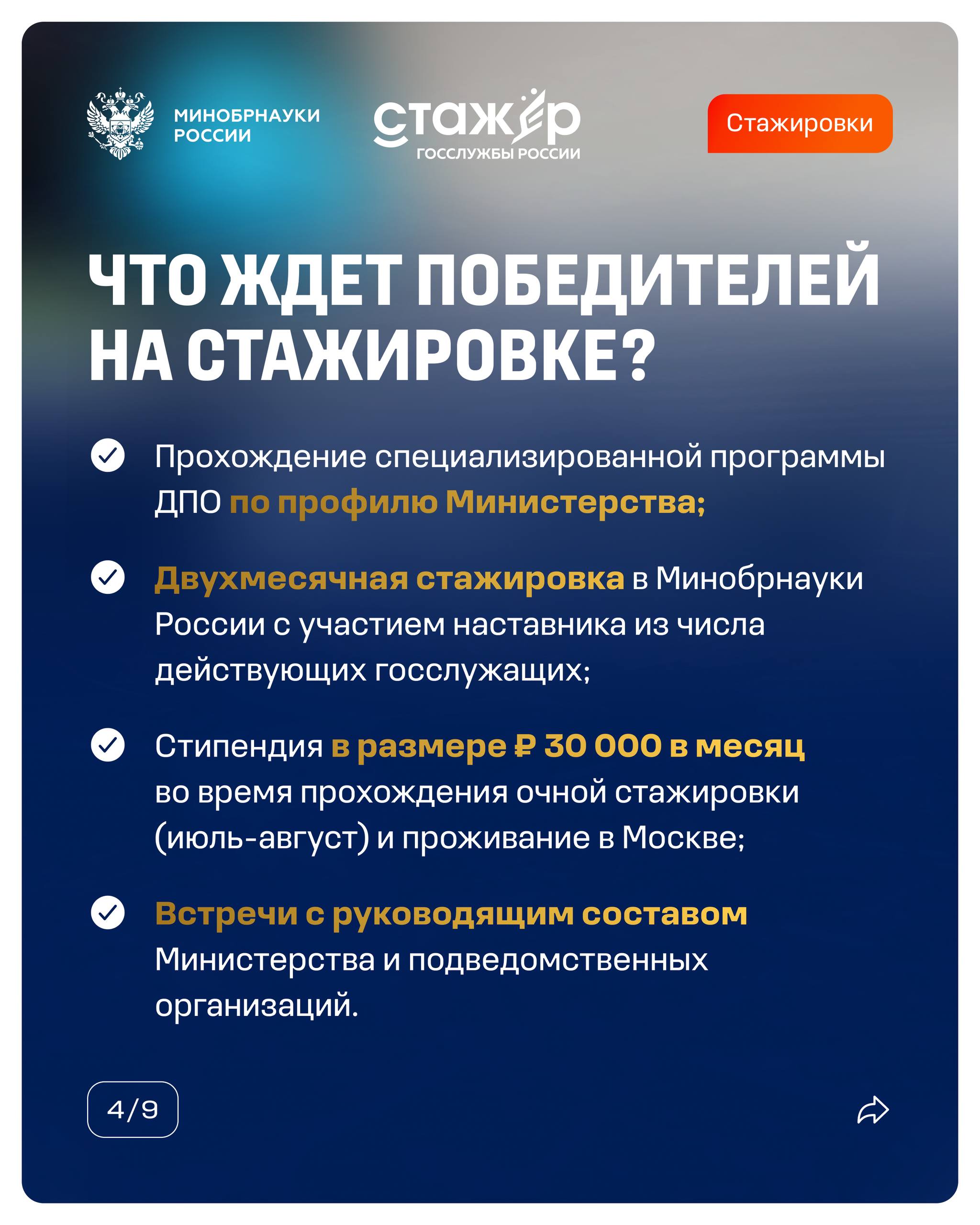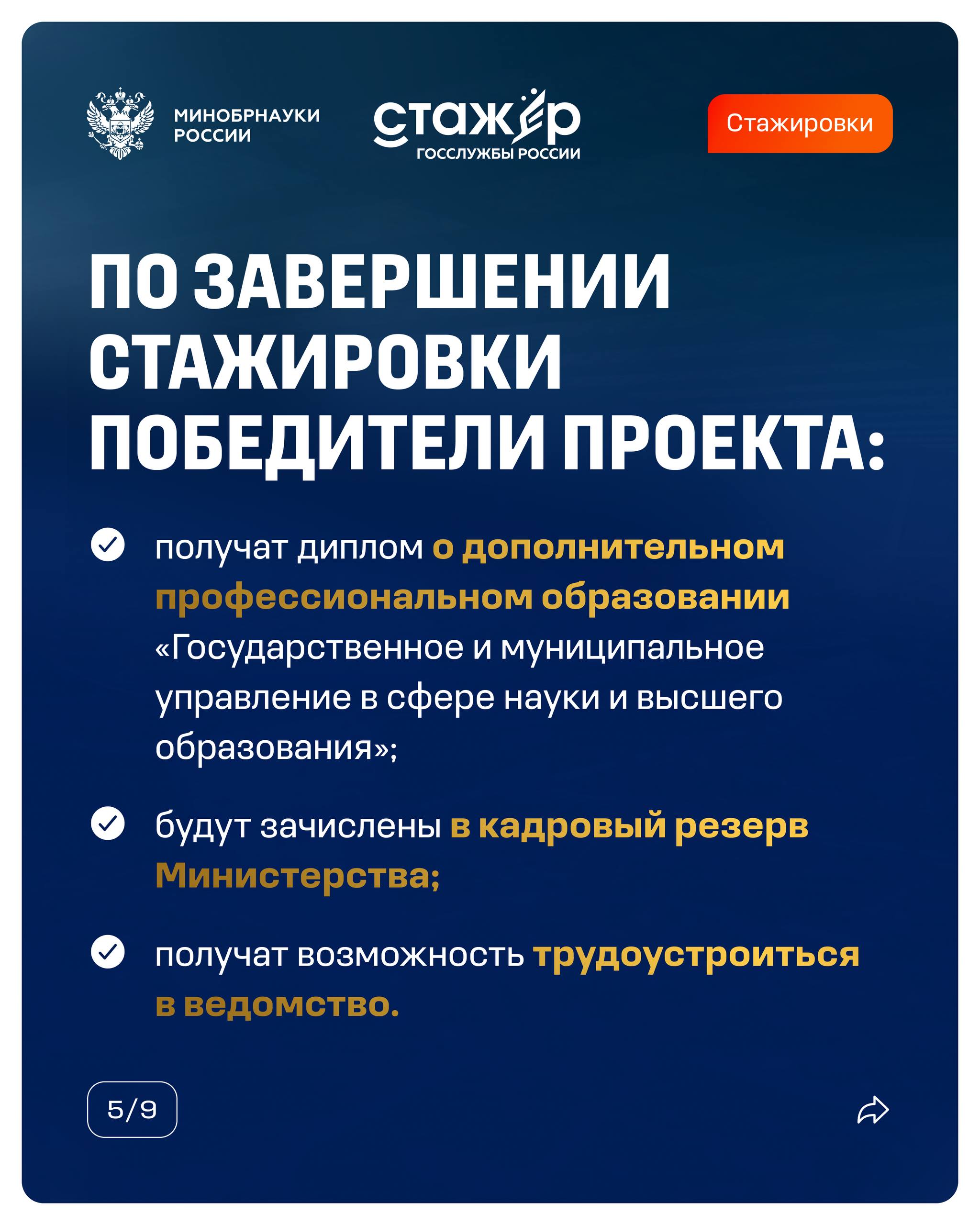 Минобрнауки России объявляет о запуске проекта «Стажер госслужбы России» для отбора молодых специалистов на госслужбу! Участникам предстоит пройти онлайн-этапы отбора, а ТОП-100 из них — поучаствовать в очной деловой игре.