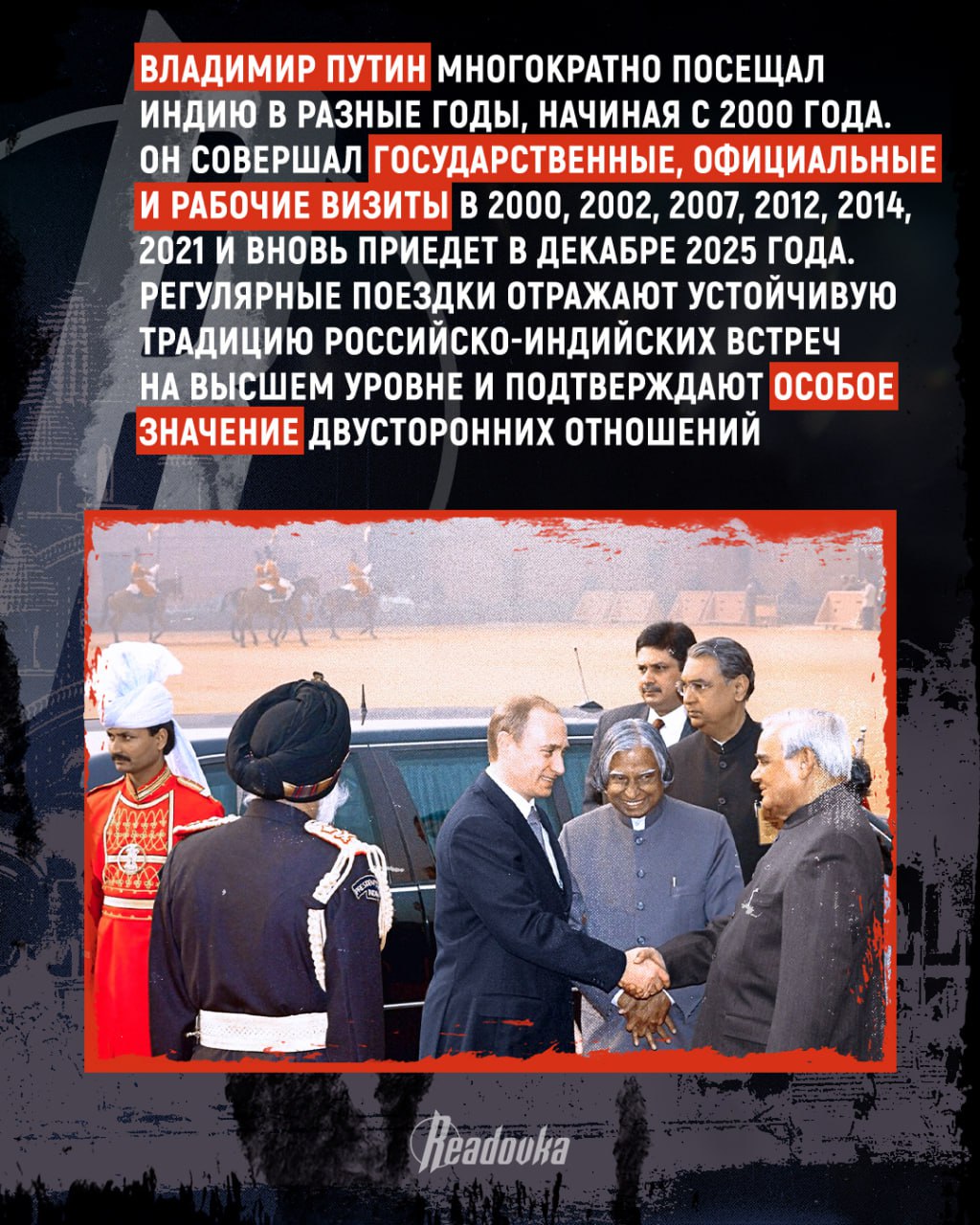 Владимир Путин прилетел в Индию и встречается с премьер-министром Нарендрой Моди, чтобы закрепить долгосрочное партнерство. Когда русский человек впервые оказался «в гостях» у Индии и какие направления остаются ключевыми — смотрите в карточках Readovka.