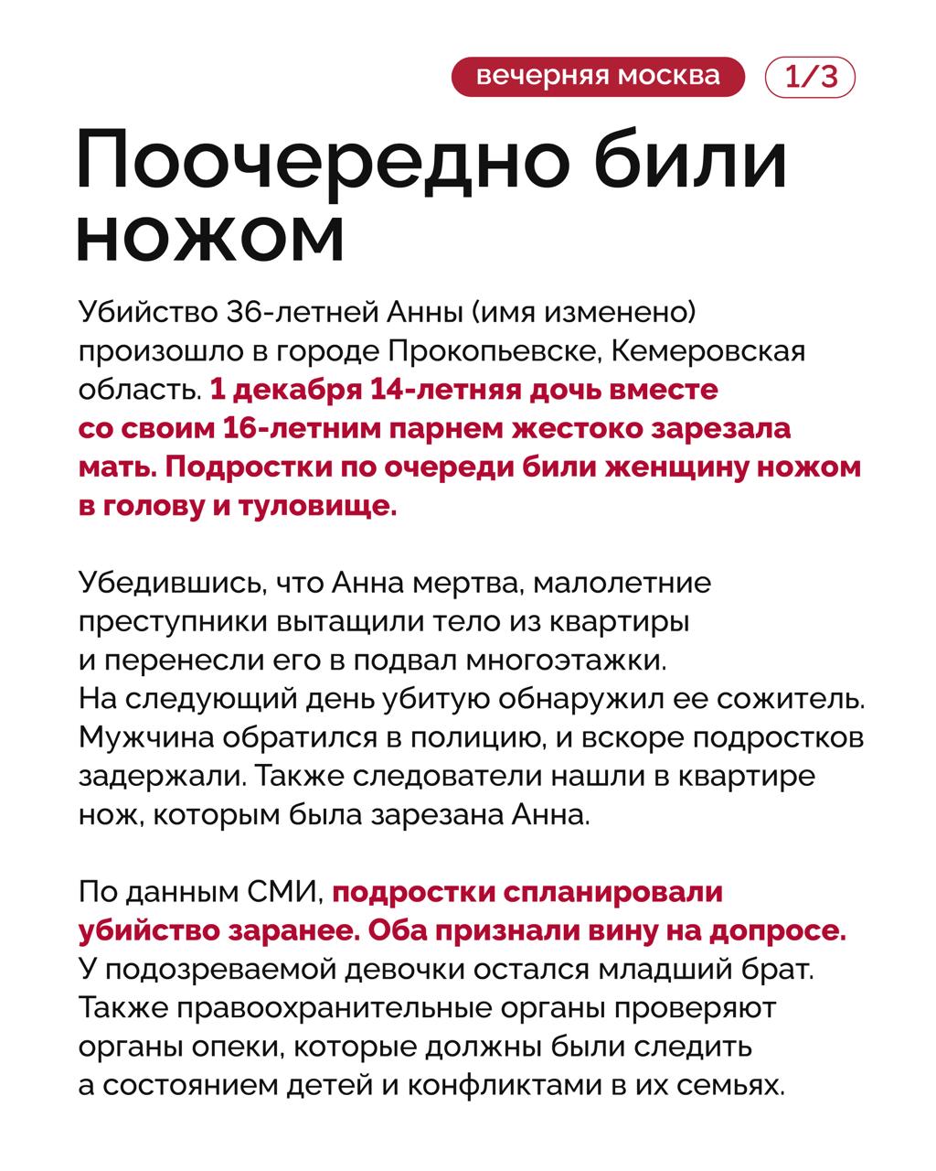 Вопиющий случай произошел в Прокопьевске. 14-летняя девочка вместе с 16-летним возлюбленным зарезала собственную мать. Причиной стали постоянные ссоры с матерью. Подростки по очереди били женщину ножом, пока та не скончалась. Затем они спрятали тело жертвы в подвале. Обоих подозреваемых задержали.