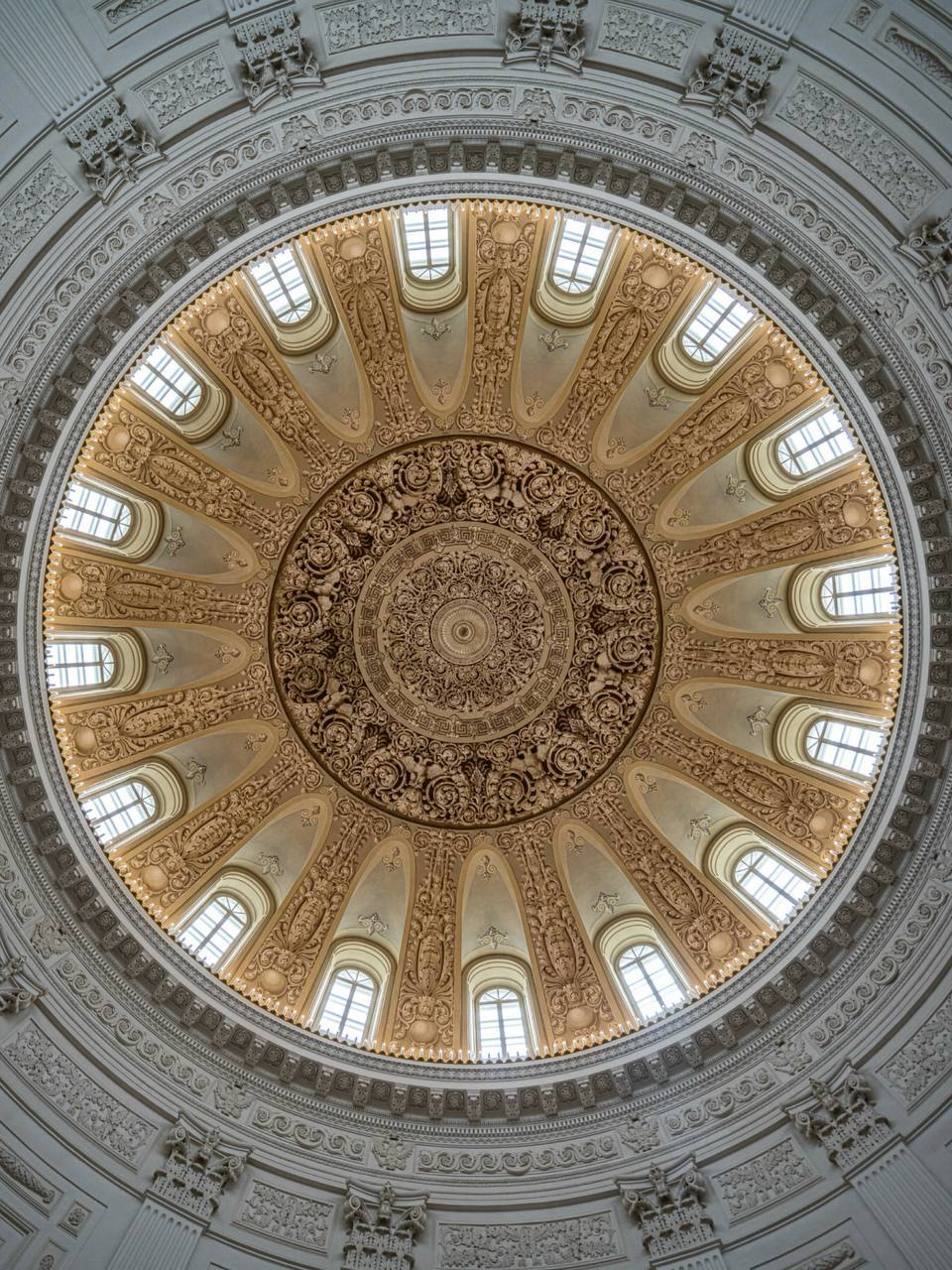 Зал-ротонда под огромным куполом ошеломляет всякого входящего! Его гризайль настолько великолепна, что хочется долго разглядывать изысканную роспись, так напоминающую пышную лепнину.