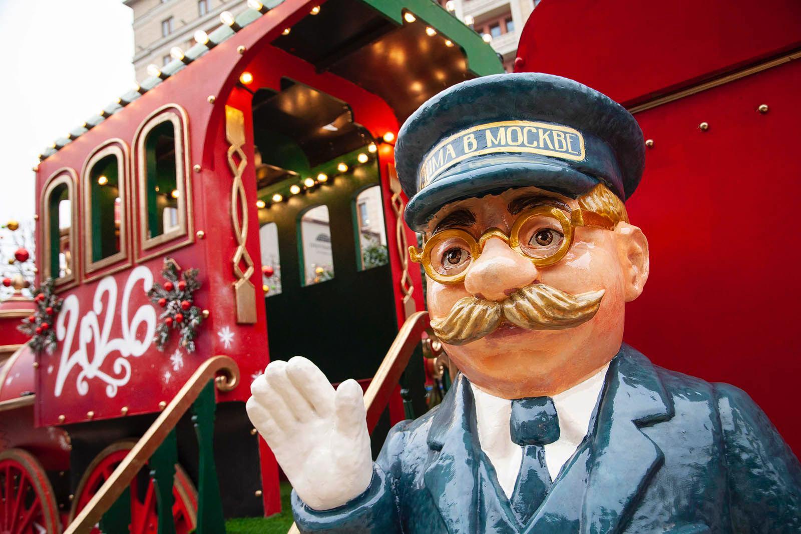 на Манежной площади раскинулся зимний городок с нарядной елкой, а еще здесь можно найти новогодние игрушки прошлых эпох.