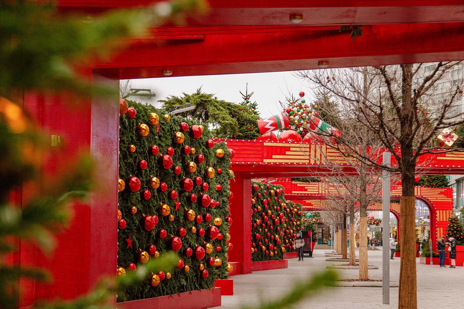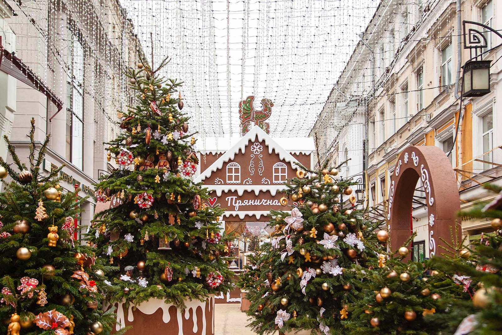 на Новом Арбате появились декоративные подарки, парящие ретроавтомобили и нарядные деревья;