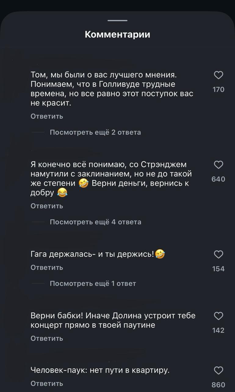 Там уже несколько дней русские пользователи активно комментируют посты голливудского актера Тома Холланда, призывая его «вернуть деньги певице Ларисе Долиной».