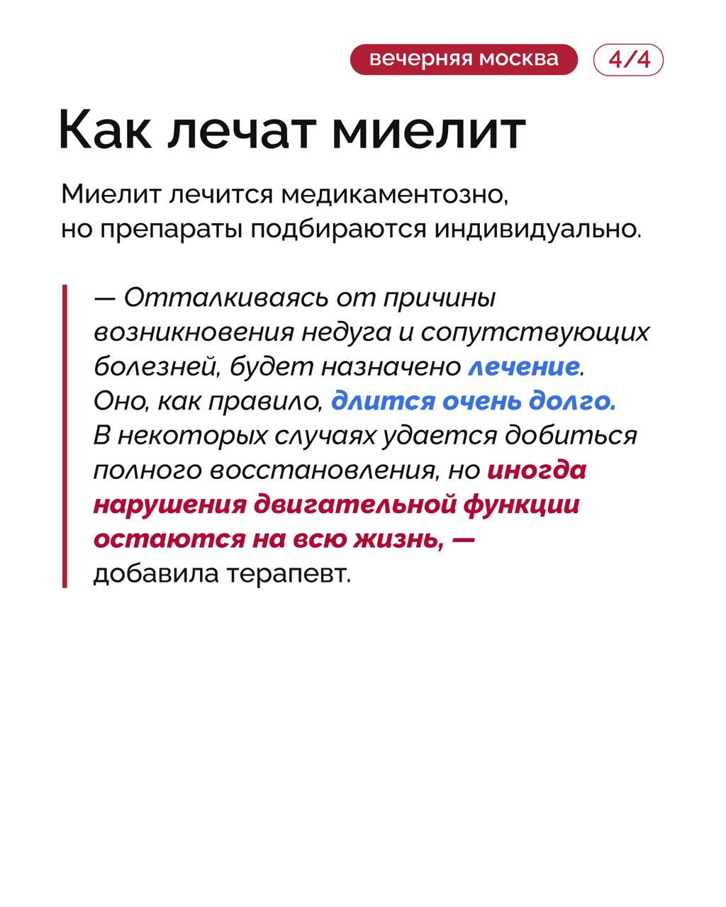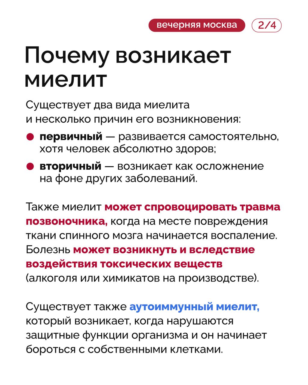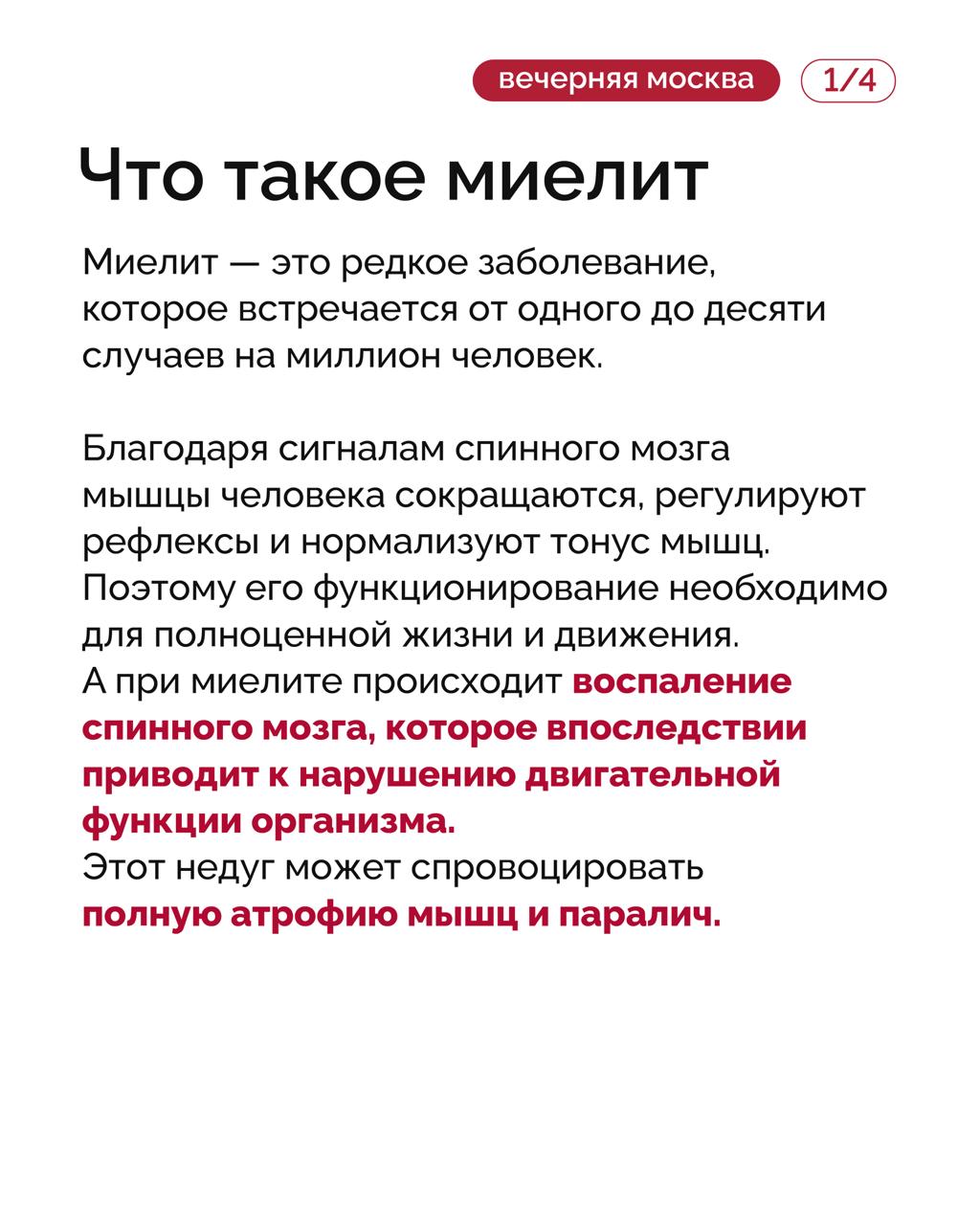 Болезнь поразила спинной мозг, из-за чего его мышцы атрофировались, и он перестал ходить. Мы узнали у врача-терапевта Надежды Чернышовой, что это за недуг, насколько он опасен и есть ли шанс восстановиться.