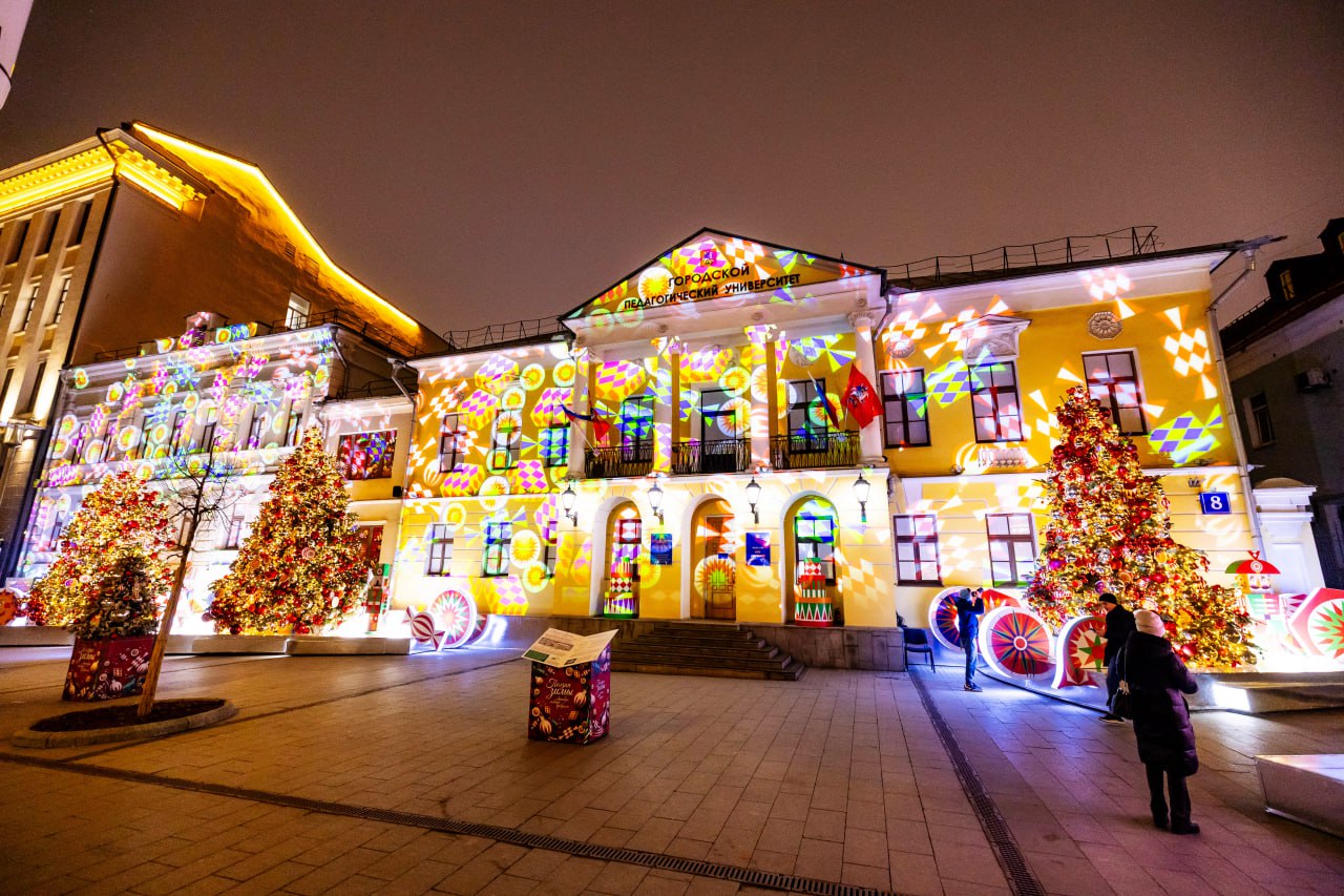 По вечерам на фасаде университета показывают световое шоу «Поэзия зимы», а на площадке установлена трехметровая цифровая книга с анимированными иллюстрациями.