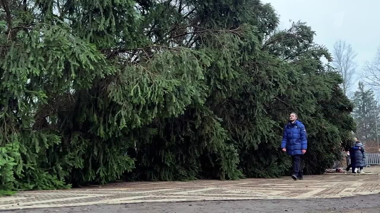 Новогоднюю красавицу нашли в Рузском районе Подмосковья. Ей около ста лет! Для удержания дерева весом восемь тонн — два автокрана. Большая команда лесорубов подстрижет елку и доведет ее крону до совершенства. Потом погрузка на тягач — он уже рядом — и непростая дорога в Москву.