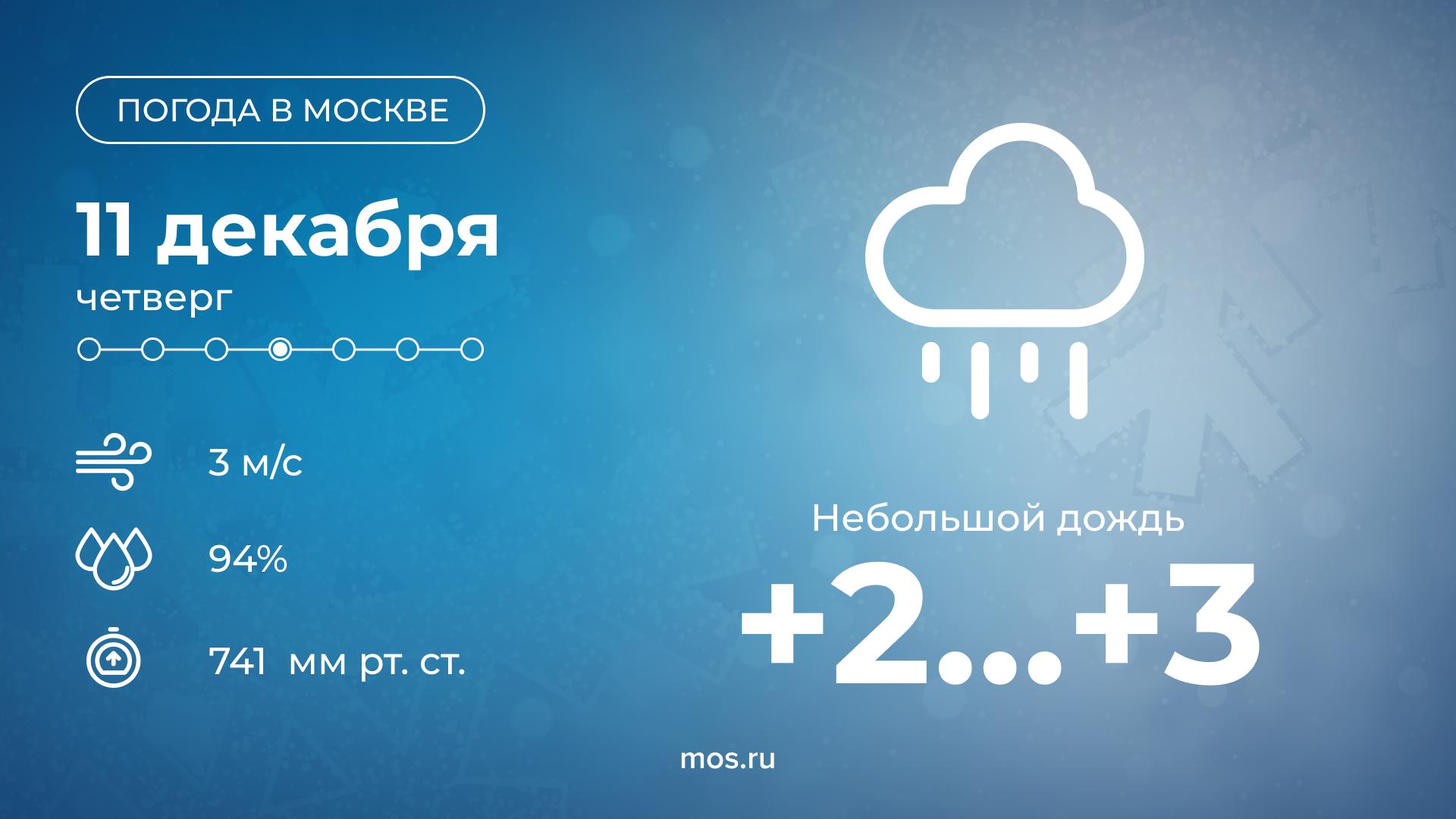 Сегодня в Москве ожидается небольшой дождь. Не забудьте взять с собой зонтик. Температура воздуха днем поднимется до +3 °С.