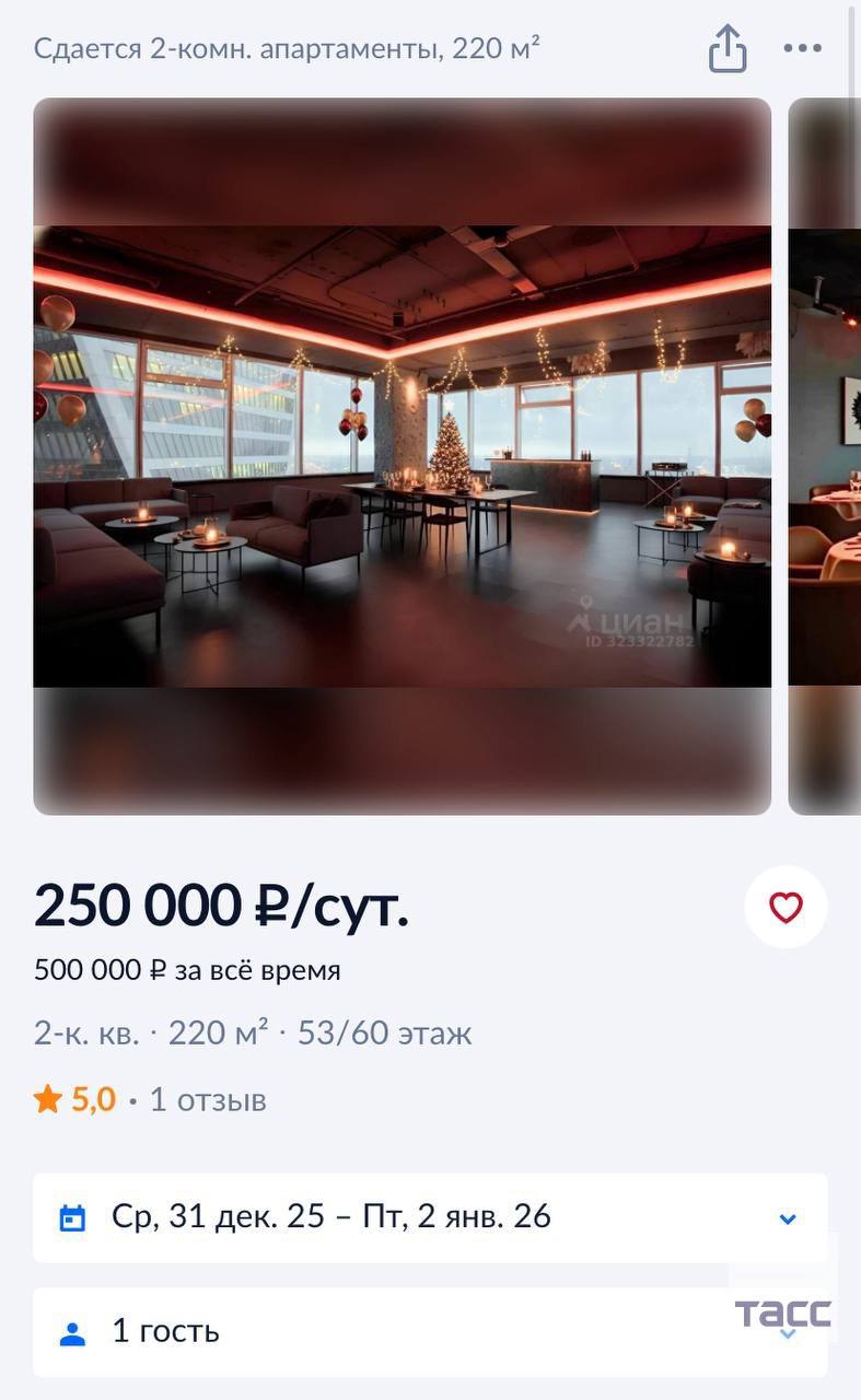 Аренда самых дорогих в РФ апартаментов на Новый год достигла 250 тыс. руб. в сутки.