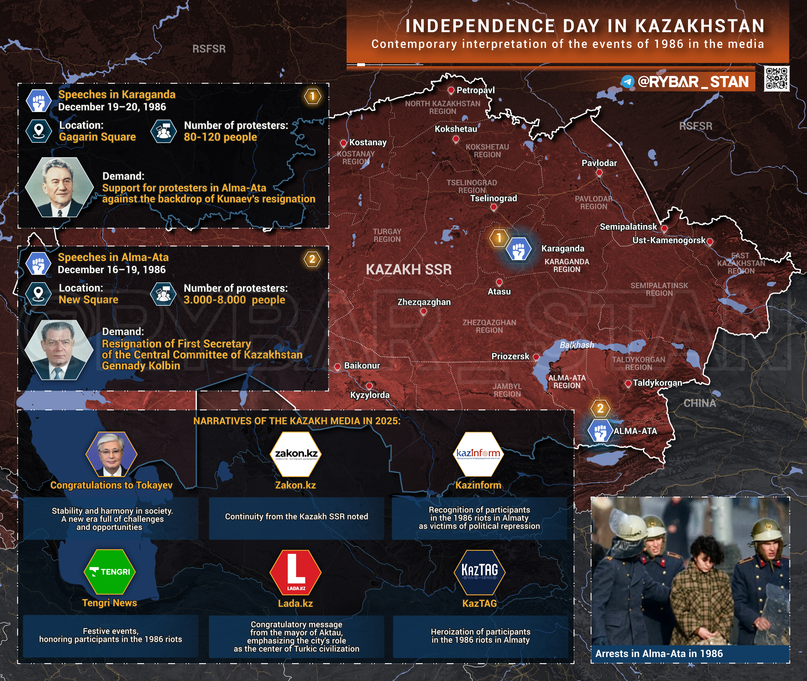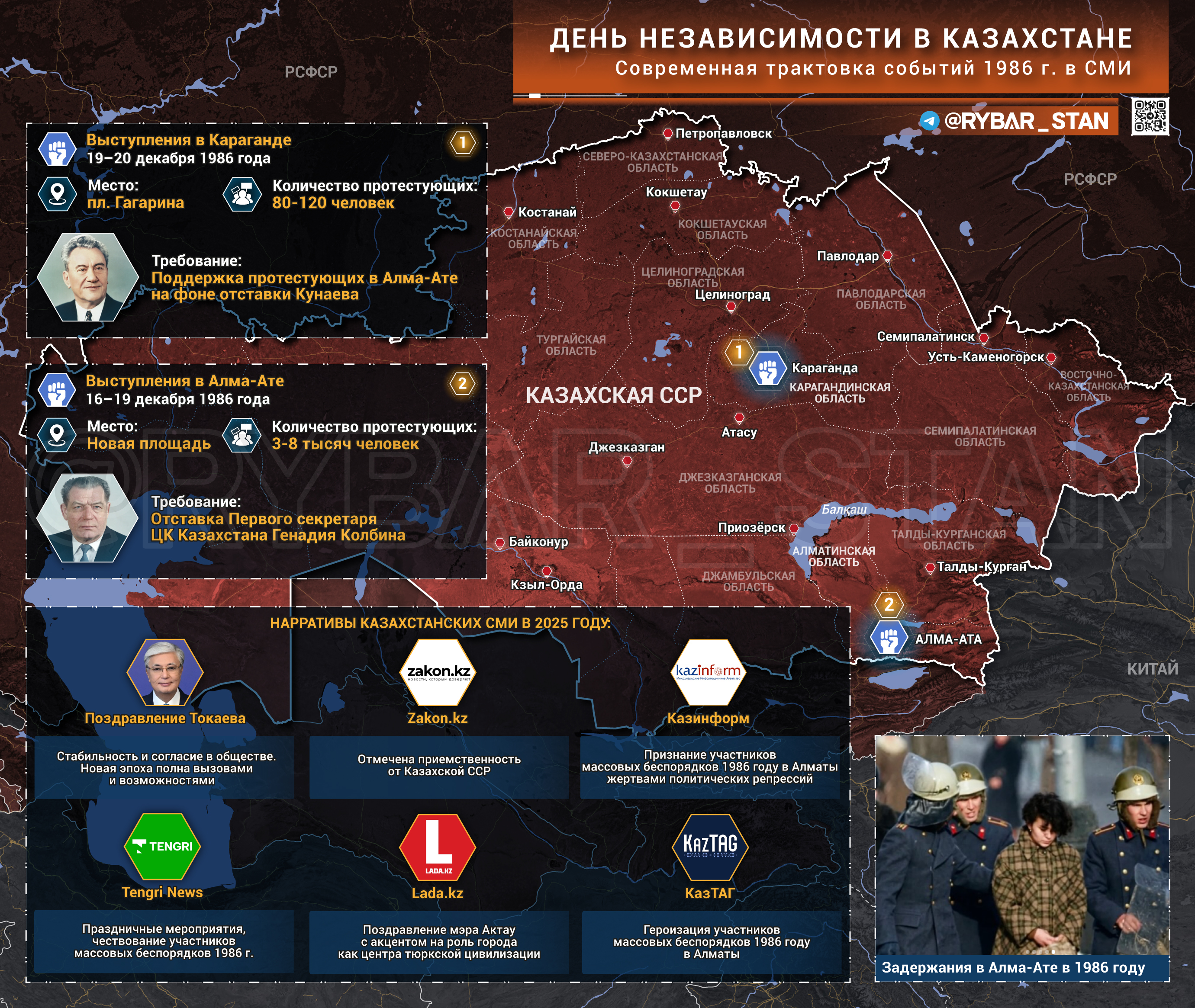 Крупное СМИ Казинформ называет тех, кто был арестован в ходе студенческих беспорядков 1986 г. на улицах Алма-Аты и Караганды, «жертвами политических репрессий».