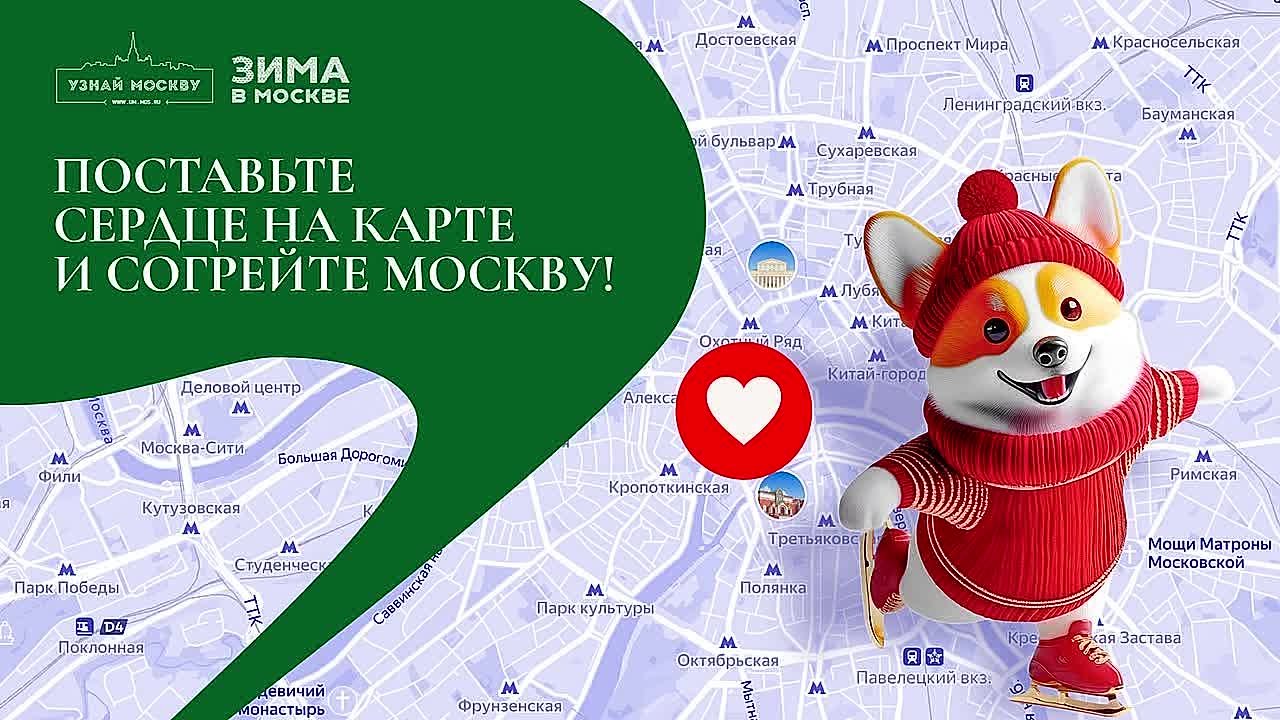 А милейший корги-маскот проекта «Зима в Москве» разместит ваше сердечко и поздравление на интерактивной карте города.