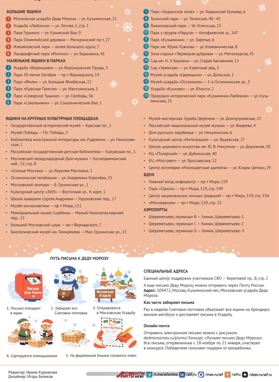 До 15 января можно отправить письмо волшебнику — более 100 почтовых ящиков разместили в парках, музеях, аэропортах и культурных центрах столицы. Авторы всех писем с обратным адресом получат официальный ответ из Московской усадьбы волшебника. Снеговики-почтовики регулярно забирают корреспонденцию из ящиков и отправляют её в Усадьбу. Впервые специальный ящик появился и в Едином центре поддержки участников СВО.