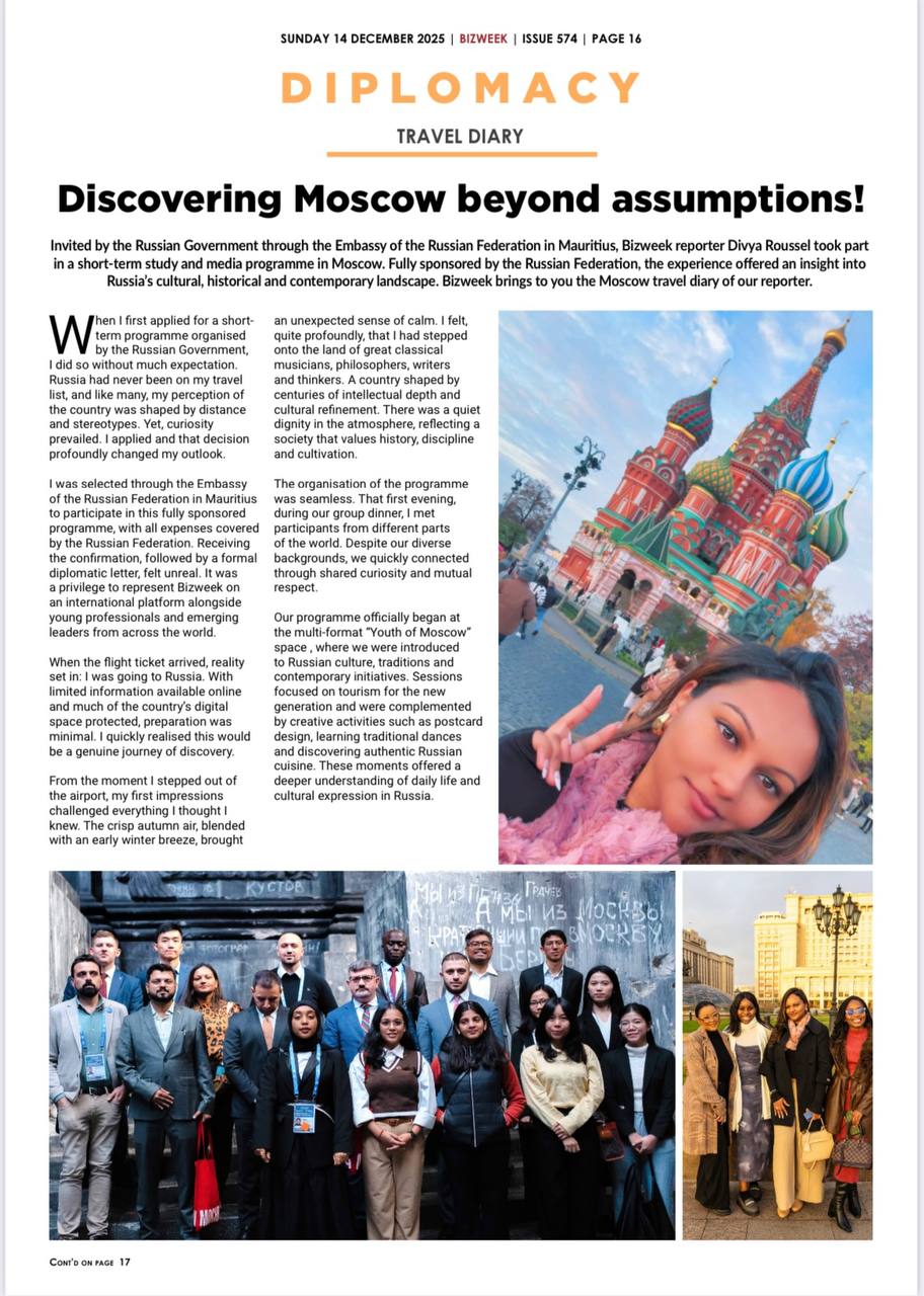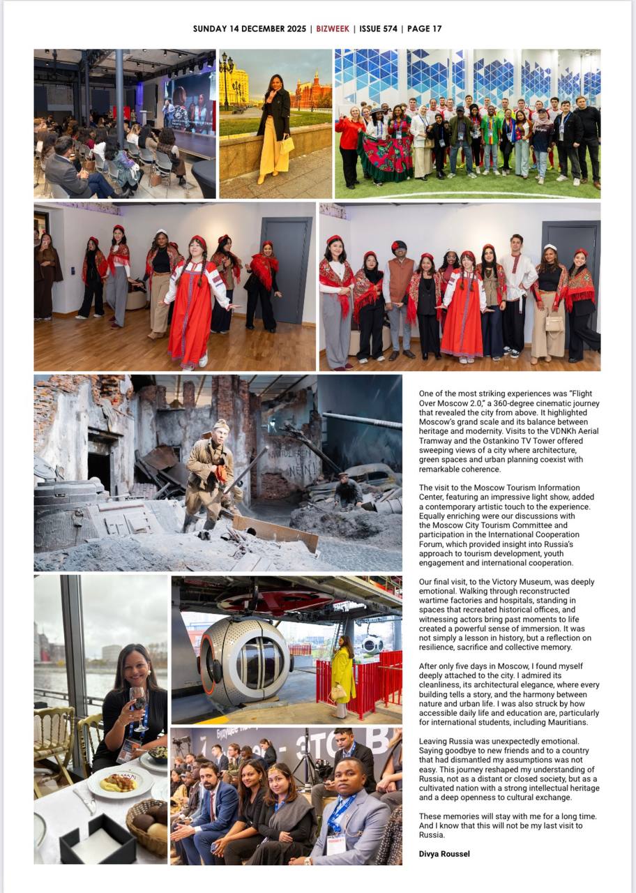 Я была отобрана Посольством России на Маврикии для участия в этой полностью спонсируемой программе, все расходы по которой покрывала Российская Федерация. Получение подтверждения, а затем официального дипломатического письма, казалось нереальным. Для меня было большой честью представлять Bizweek на международной платформе наряду с молодыми профессионалами и будущими лидерами со всего мира.