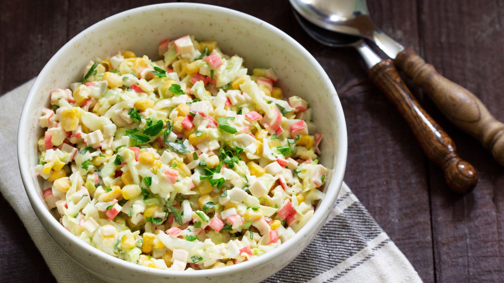 Если вам надоел стандартный крабовый салат, попробуйте приготовить его с добавлением необычного ингредиента. Салат получится вкусным и праздничным. Кроме того, дорогих и «сложных» продуктов брать не придется.
