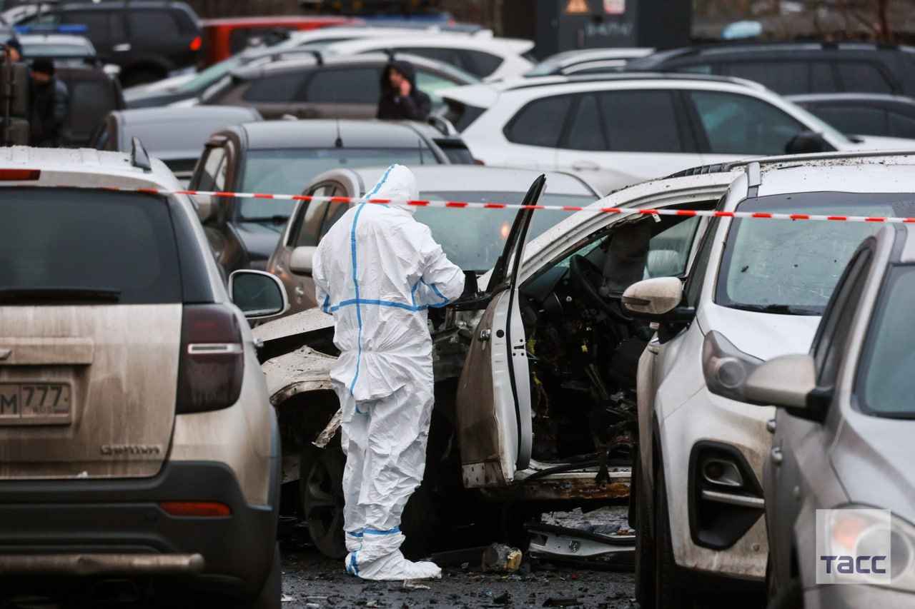 Кадры с места теракта в Москве, где украинские выблядки взорвали автомобиль с генерал-лейтенантом Сарваровым