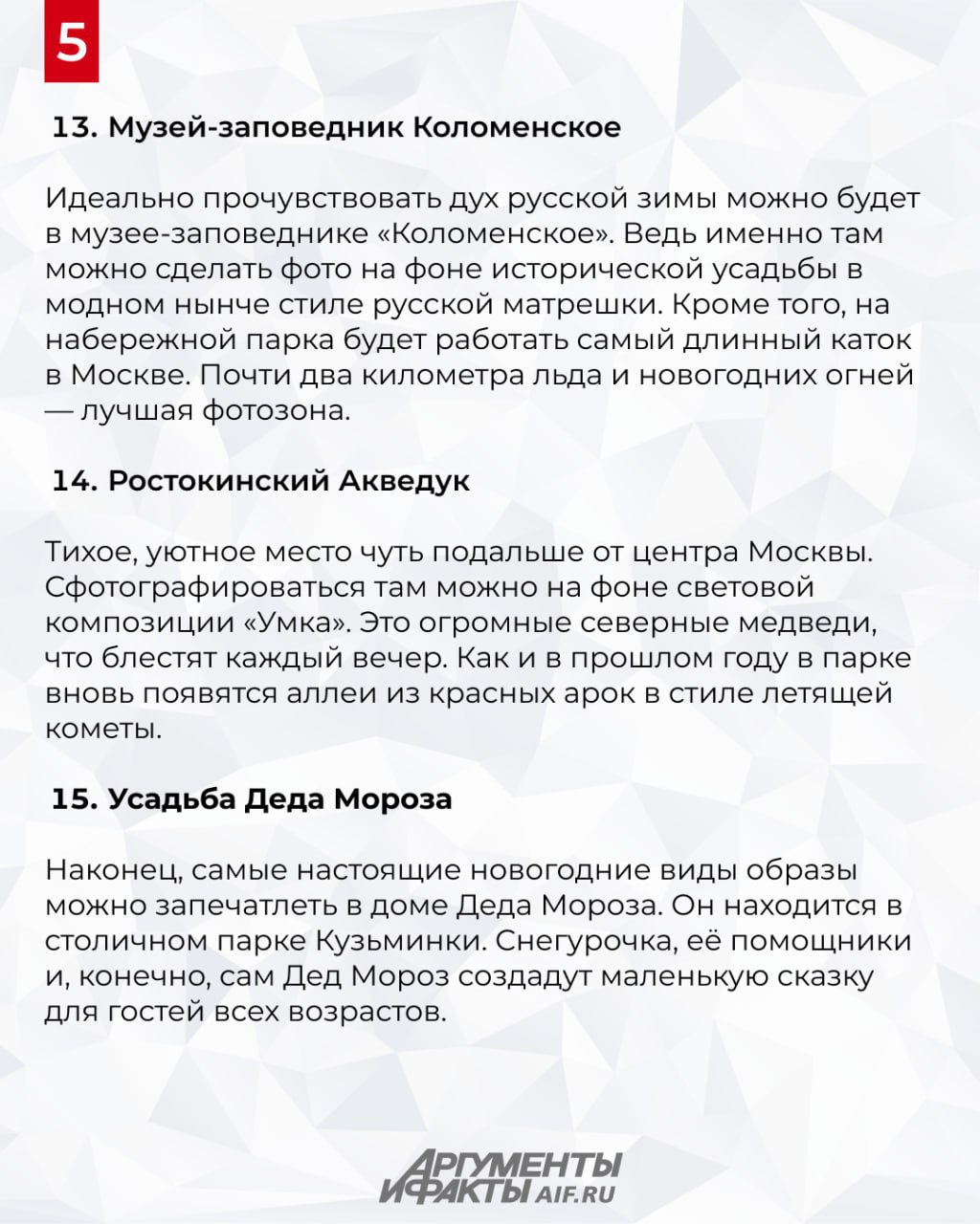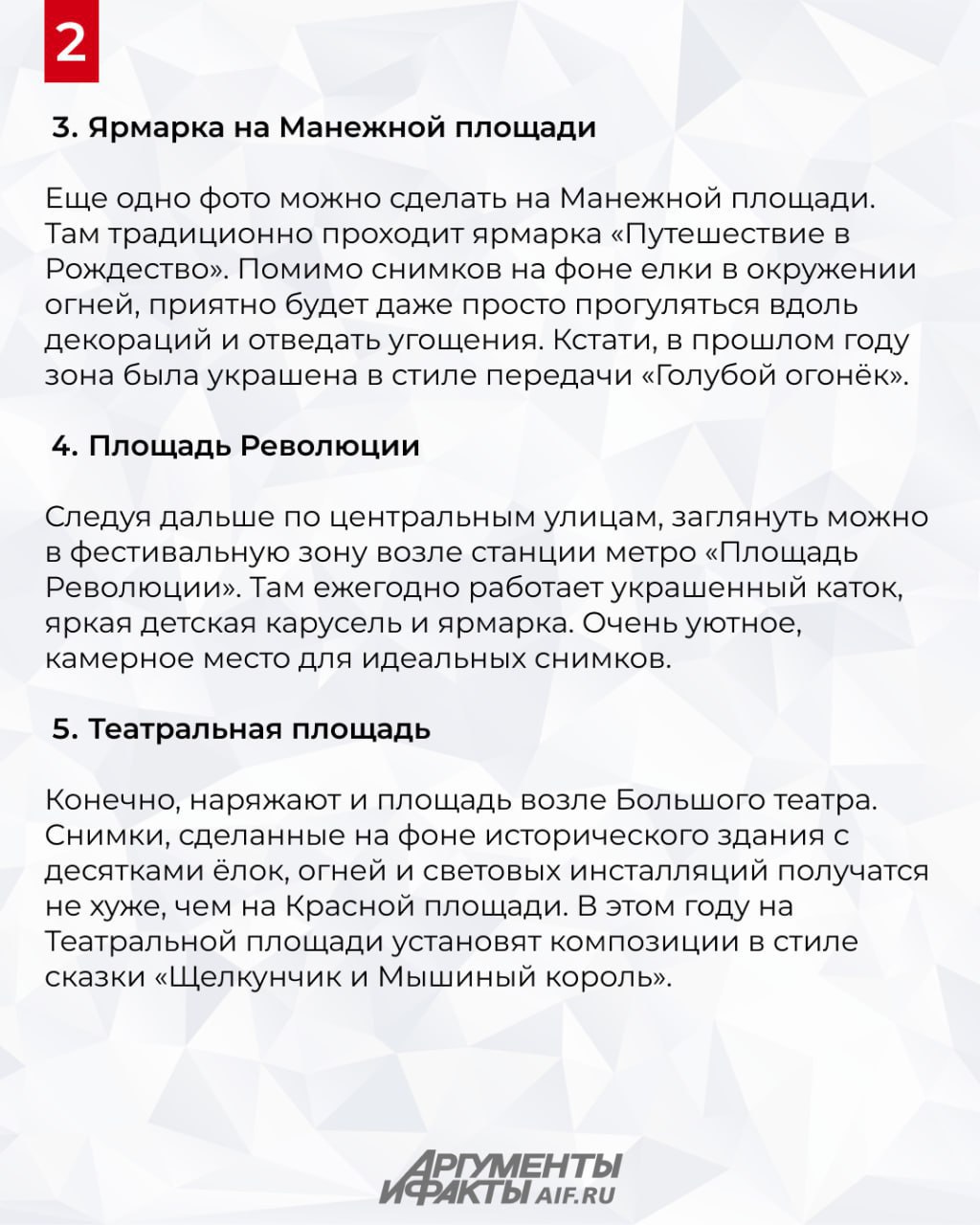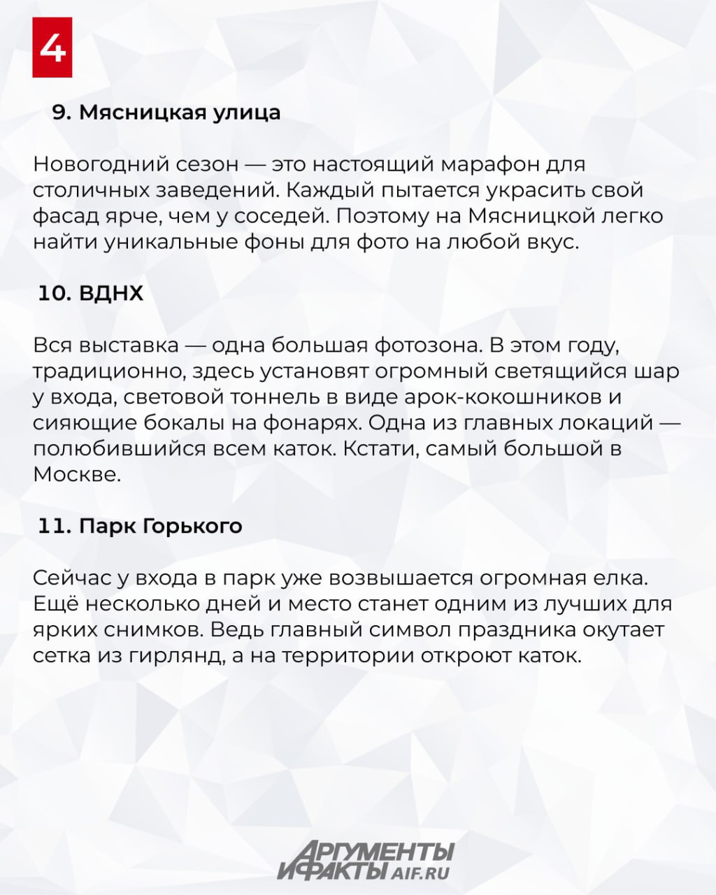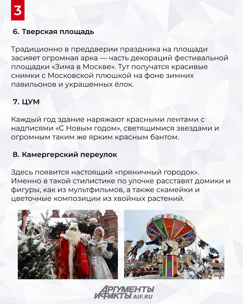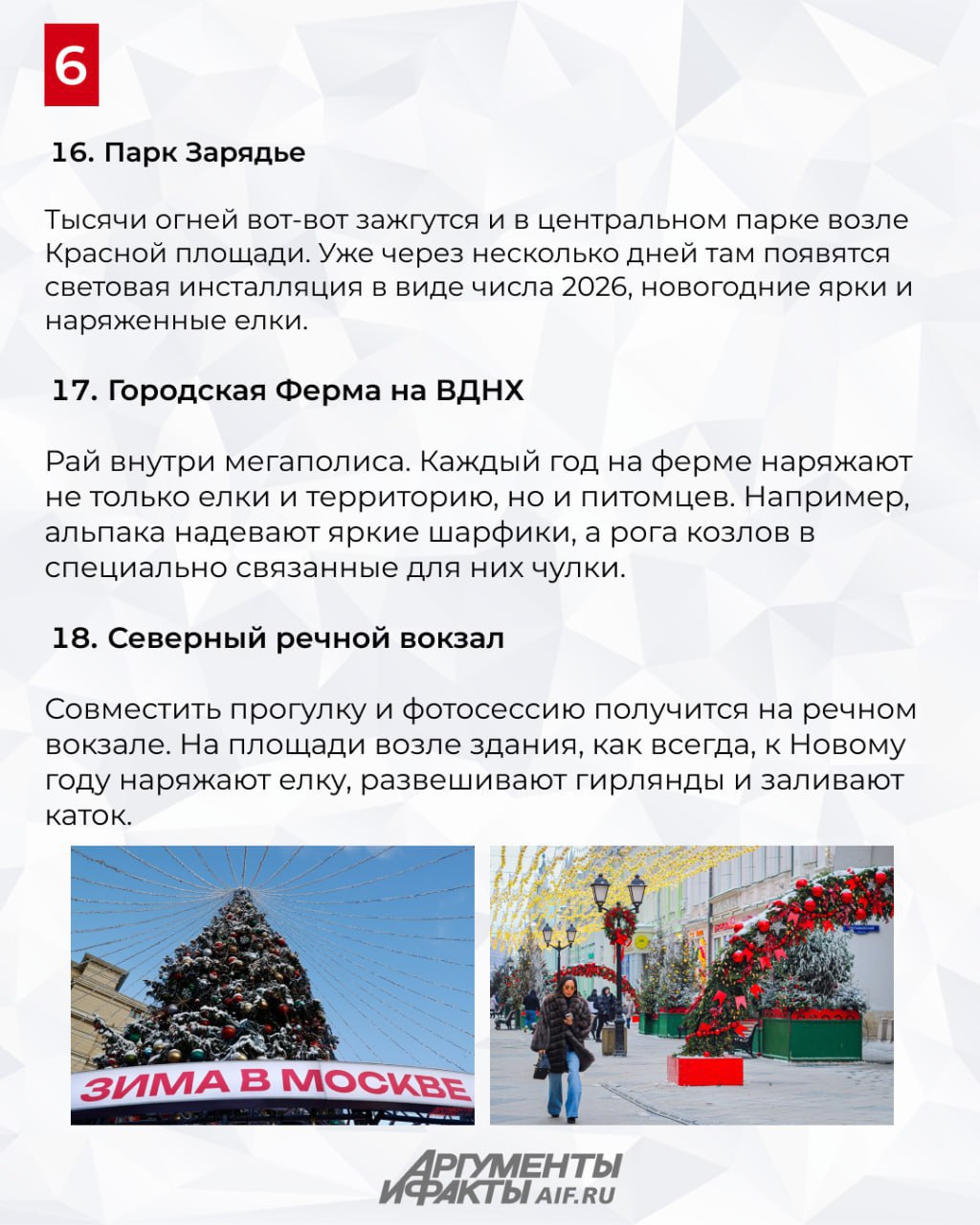 Самое яркое и популярное место в столице на новогодних праздниках — это ярмарка на Красной площади и ЦУМ. Яркие украшения, каток, фотографии с видом на аттракционы и елки, киоски с ароматными плюшками и горячим чаем. Но в предпраздничные новогодние дни в Москве открывается еще огромное количество локаций, идеальных для прогулок и запоминающихся фотосессий. Где они находятся — рассказали в карточках.