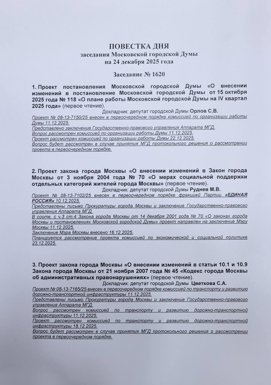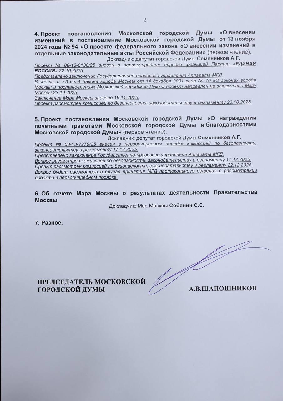 В среду, 24 декабря, проведём очередное заседание Мосгордумы. Подписал повестку, прилагаю.