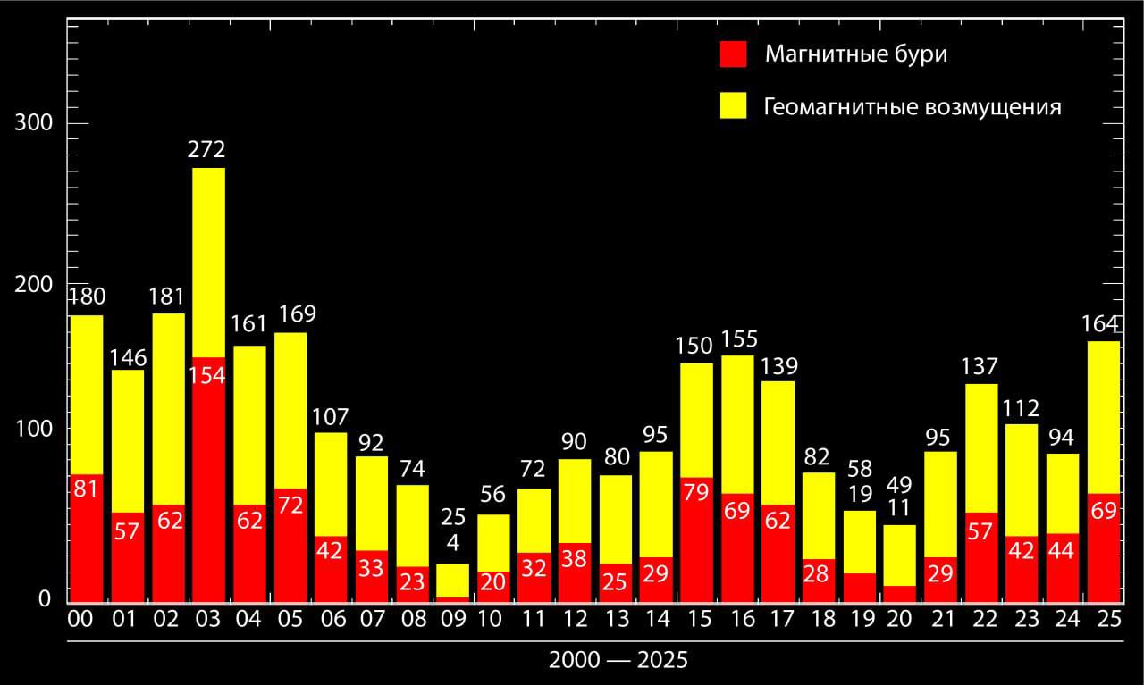 Количество дней с возмущениями магнитного поля Земли достигло 164 — это на 75% больше, чем в прошлом году.