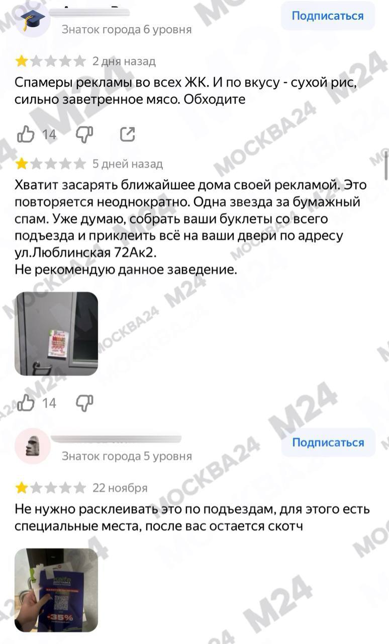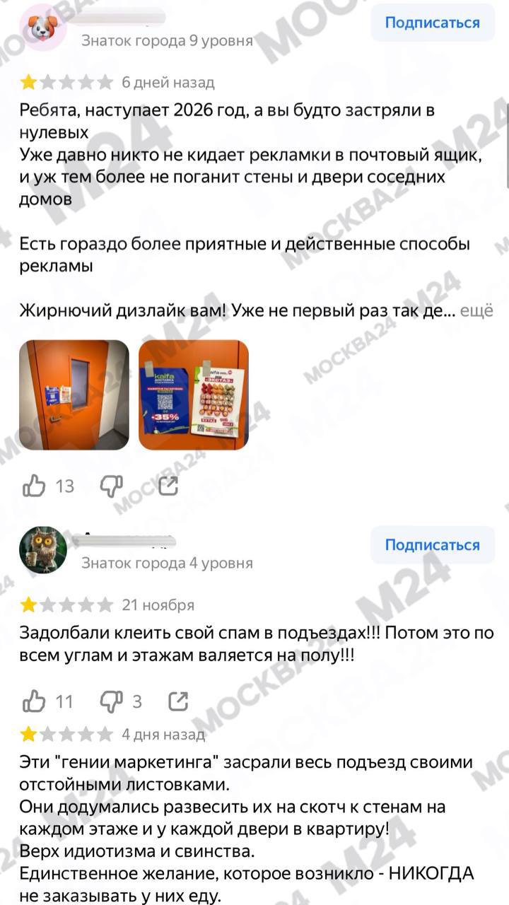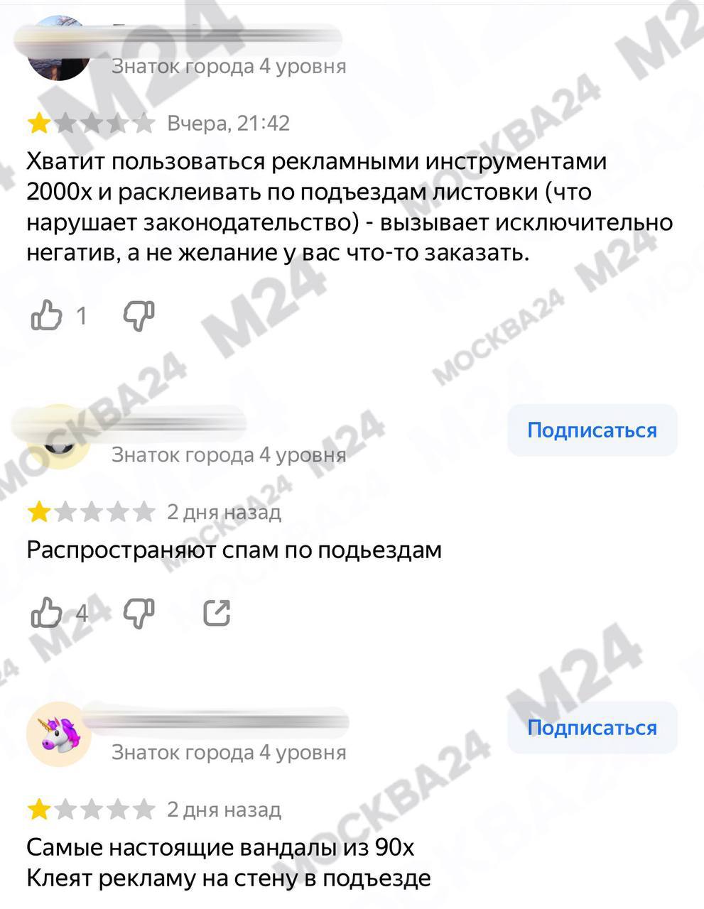 Москвичи вывели свою формулу наказания за слишком агрессивную рекламу: в сервис доставки полетели десятки негативных отзывов от жителей района Марьино за листовки в подъездах.
